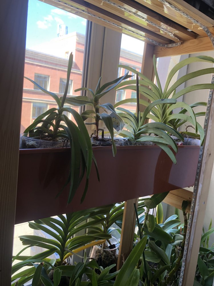 Полив: зимой умеренный, путем залива горшка теплой водой, потом полностью слить или, если корни достают до дна, просто подлив и полная просушка. Летний полив- это просто подлив на дно воды, которая на жаре испаряется и питает корни. Ни в коем случае не оставляйте на жаре залитые водой горшки- корни сварятся. Со временем в горшке образуется своя микрофлора- стенки покрываются зелеными водорослями и Вандам это очень нравится. У Ванд тоже есть период покоя после цветения, минимум 2-3 месяца. Летом стимулировать на цветение не надо, а вот зимой можно: вычитала в инт. один секретик и опробовала его: если вы считаете, что Ванда отдохнула и ее надо побудить к цветению, горшок заливается горячей водой около 40-50 градусов и стоит до остывания, потом не забудьте хорошо слить. Читала, что многие поливают под душем. Я не согласна. Попадая в пазухи, начинается гниение и я перестала этим заниматься. Моя знакомая содержит Ванды на крюках, а корни обматывает обильно мхом и в капрон( сори, женские колготки использует). Потом обильно опрыскивает и получается более влагоемко, чем просто голые корни. Так как Ванды очень объемные( хотя есть и минички), поэтому я их ставлю в длинные пластиковые ящики и на стеллажи. Вот, в принципе, и все о чем вспомнила. УДАЧИ ВСЕМ!