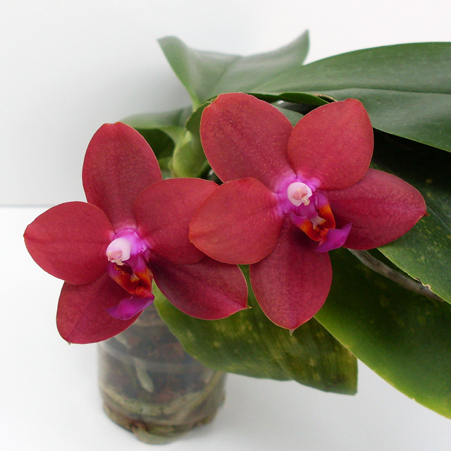 Phalaenopsis Mituo Sun Queen во время цветения также пахнет помадой, поскольку в родословной имеет 50 % phalaenopsis bellina. Но другая родительская половина сделала её совсем непохожей на беллину. Сложный, поистине королевский карминовый цвет лепестков и их плотная текстура всецело оправдывают название этого красивого гибрида.