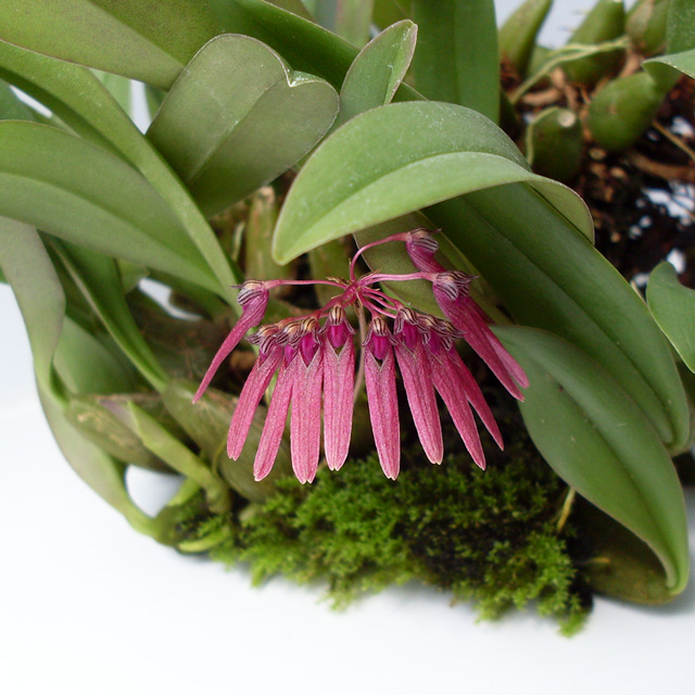 Одной из ярких, запоминающихся и долгожданных премьер стало цветение Bulbophyllum pumilio. Красавец из вьетнамского леса появился у меня пять лет назад. Это первый бульбофиллум, который мне удалось зацвести, с забавным и не отталкивающим запахом сушеного укропа. Цветоноса было два. Его цветки напоминают мне сложенные крылья насекомых, зачем-то надевших медные шлемы пожарных.