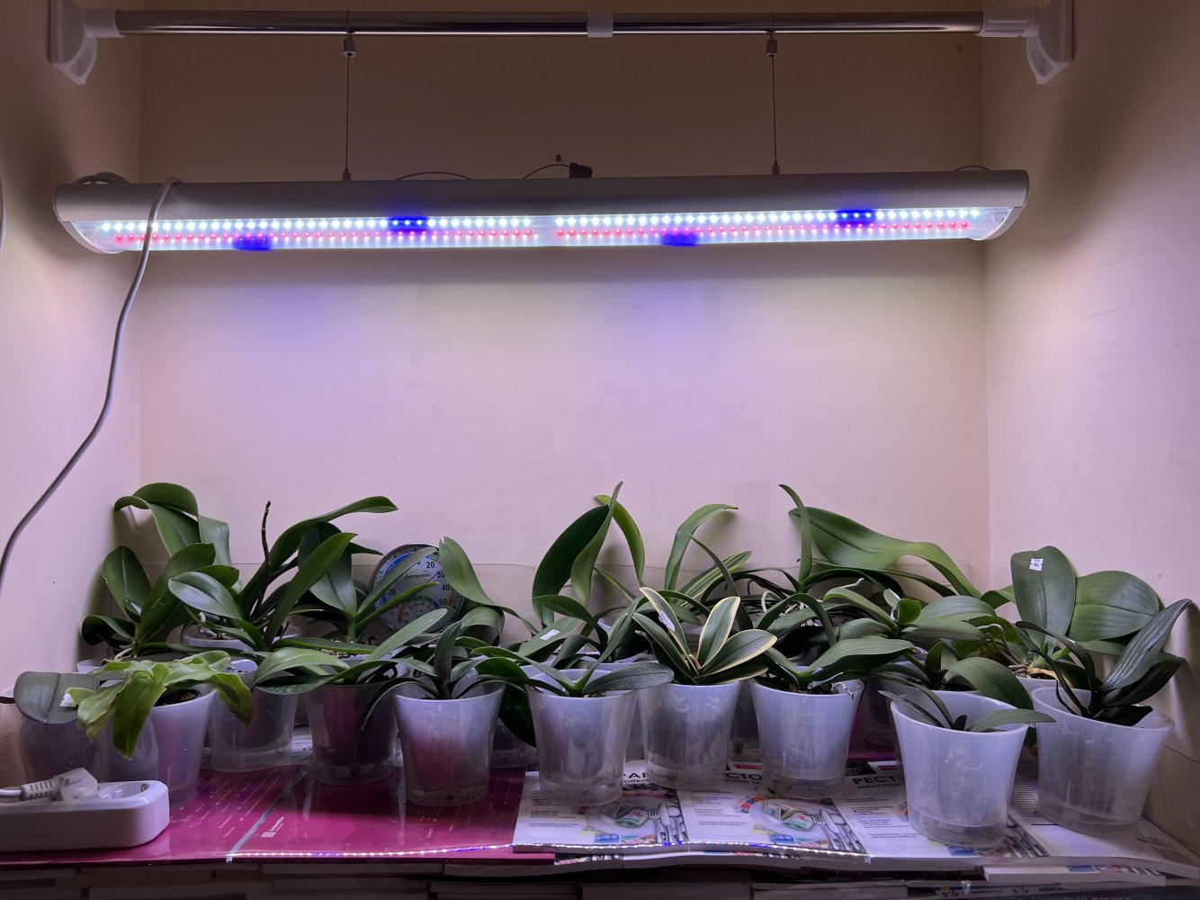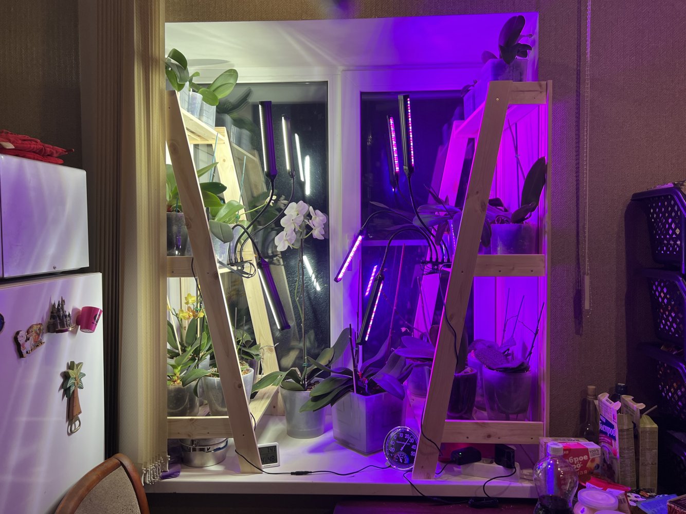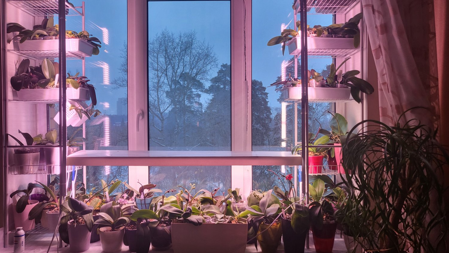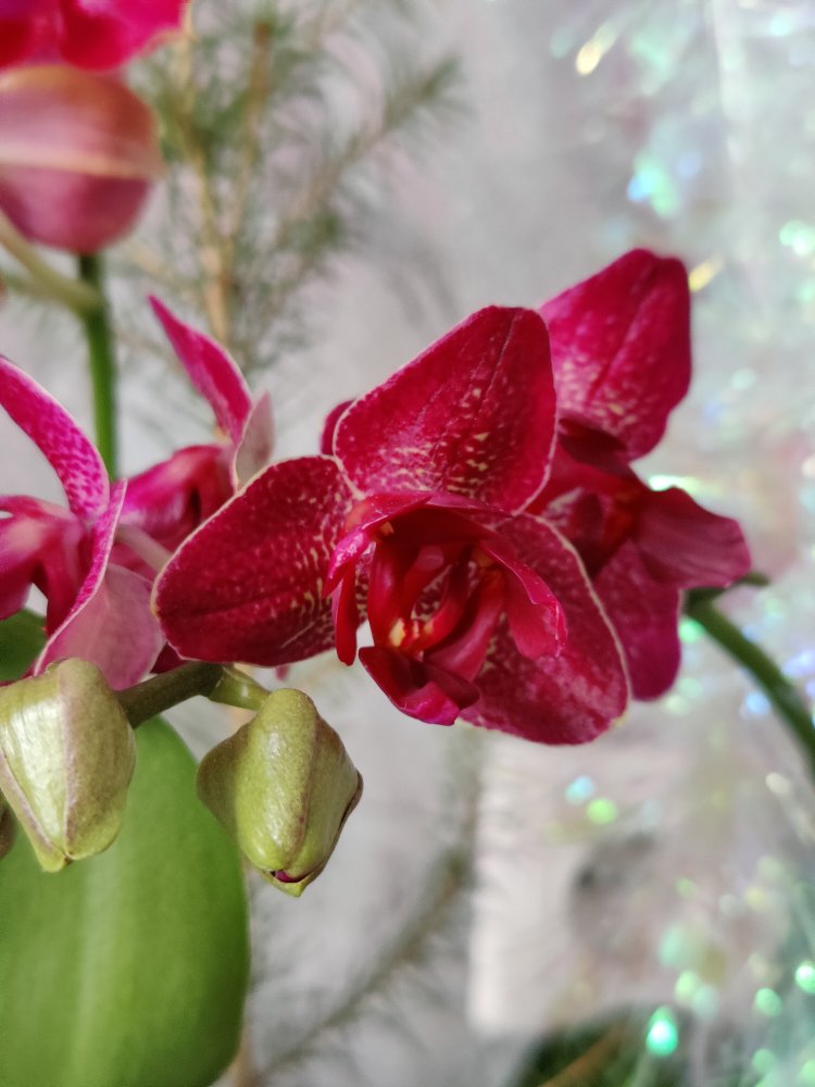 У меня первые орхидеи (белый и розовый фаленопсисы) появились еще в прошлом веке:). Постепенно они заменяли собой марантовые, фикусы, другие красиволиственные. На сегодняшний день кое-что из прошлых зарослей, конечно, осталось, но в основном окна и полочки занимают орхидеи. Коллекция - это громко сказано: растут те растения, которые нравятся по цвету или долгоцветущие. Количество орхидей - около 200 сортов (принципиально не считаю, боюсь, что цифра будет аргументом против приобретения новых). Мне нравится приобретать малышей и растить их, иногда специально покупаю у разных фермеров один и тот же сорт, хочу получить желаемое цветение. Почему в основном держу фаленопсисы? В моих условиях они отлично растут и цветут, причем практически круглый год. Но на Новый год у меня фантастический праздник!