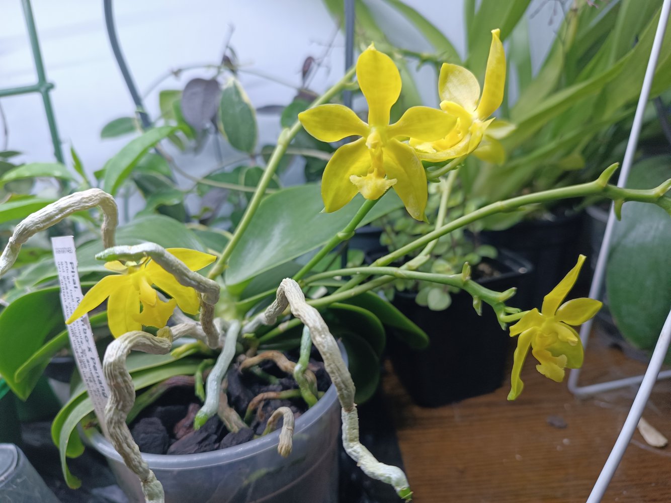 Три цветоноса, один цветёт, второй дует бутоны, третий, похоже засушила всё