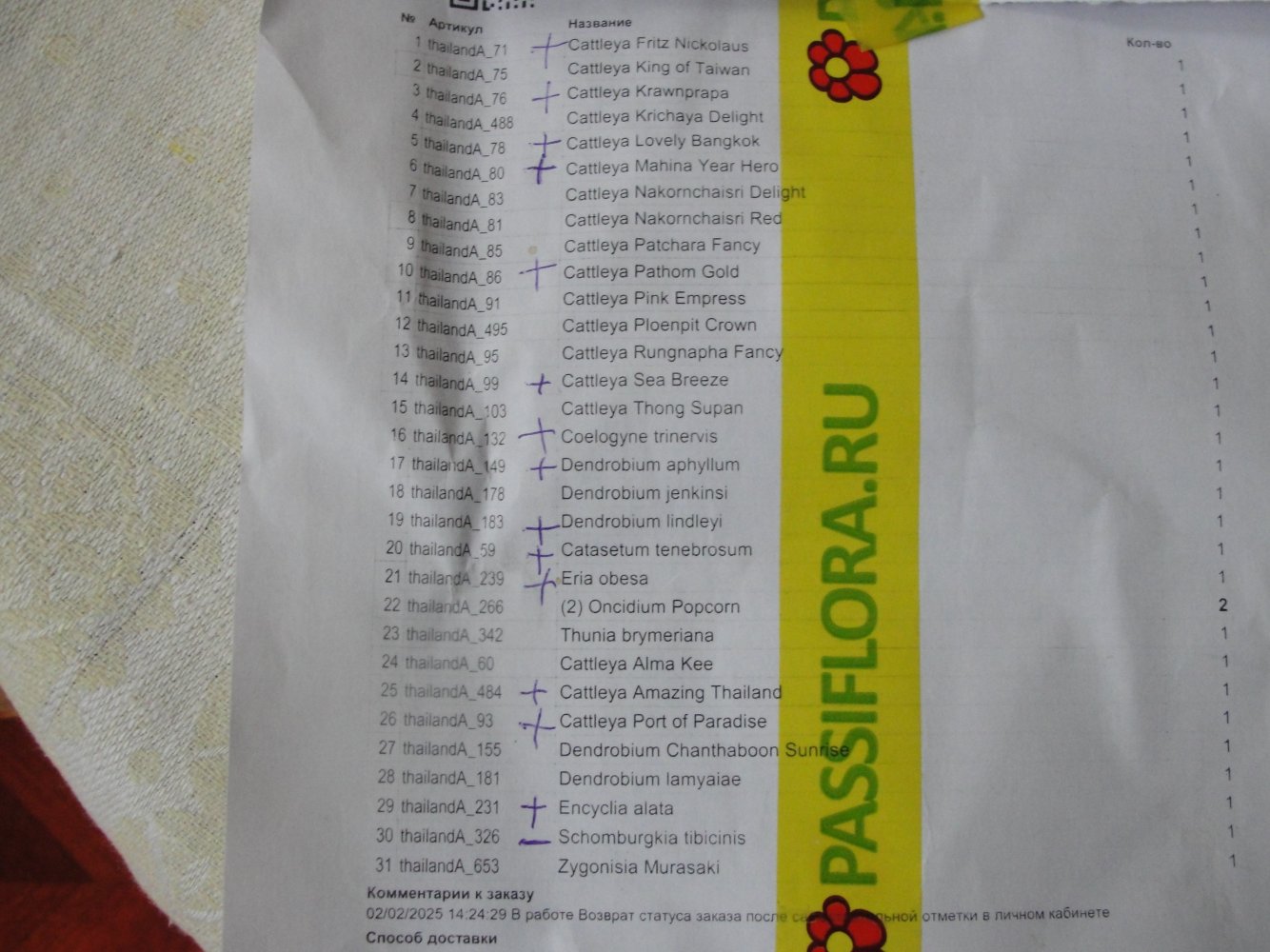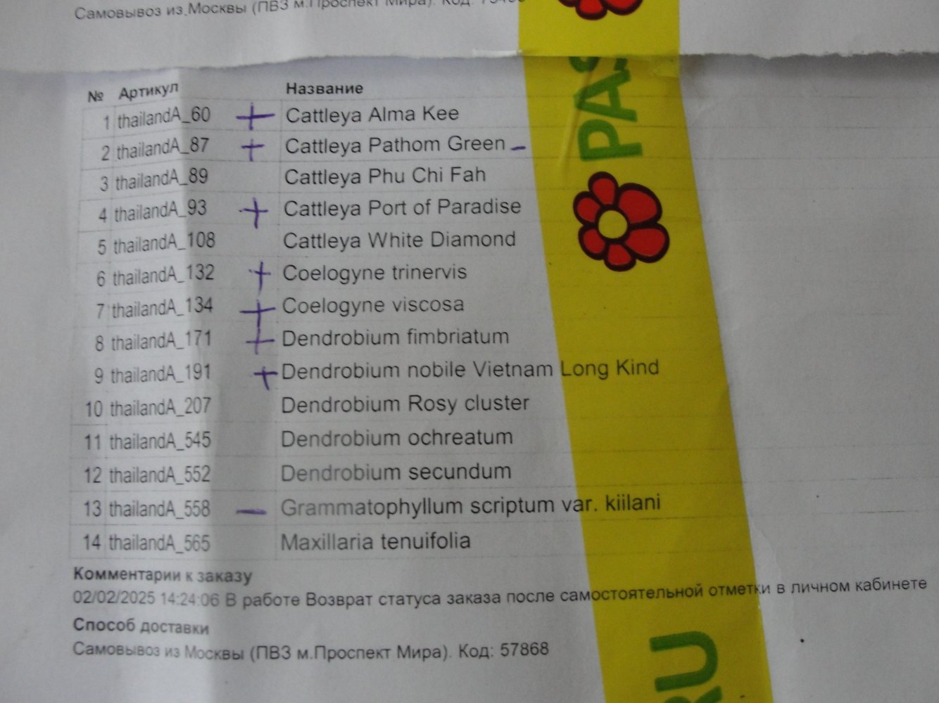 Так , с чего начать....с плюсов - качество отличное , не смотря на сильную пересушку растений , отпаиваются хорошо , корней живых более чем для лёгкой реанимации , скорее интенсивная адаптация))Катлеи супер , слоны , кони ...с чехлами , пару с бутонами ..нет ни одной запревшей , молодые ростики на отлично .Минусы - половина замены , по катлеям из замен 50% не критично ( грубо ,вместо желтой положили оранжевую и т. д. таких нет , пригодятся ))) половина повторы , что ни есть гуд . По накладным плюсики то что по списку , остальное замены.Два трупа -Schomburgkia и Катлея Krawnprapa , катлея такая есть в повторе ( это хорошо ) .замена Граматофилума (sciptum) на монстра граматофилум специозум .