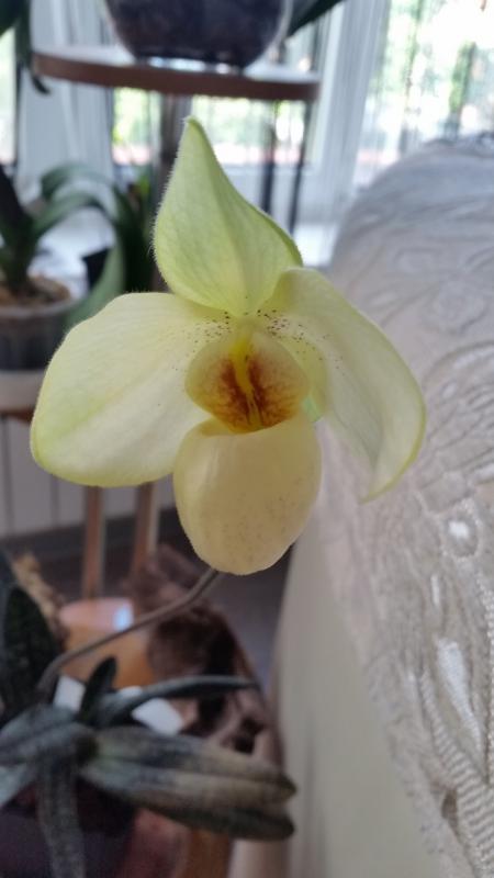 Paph. armeniacum x delenatii пришел в мае. Сегодня распустился, но озадачил меня своим цветом. На фото от поставщика он должен быть белым, а у меня какой-то лимонный. Может когда полностью раскроется, побелеет?