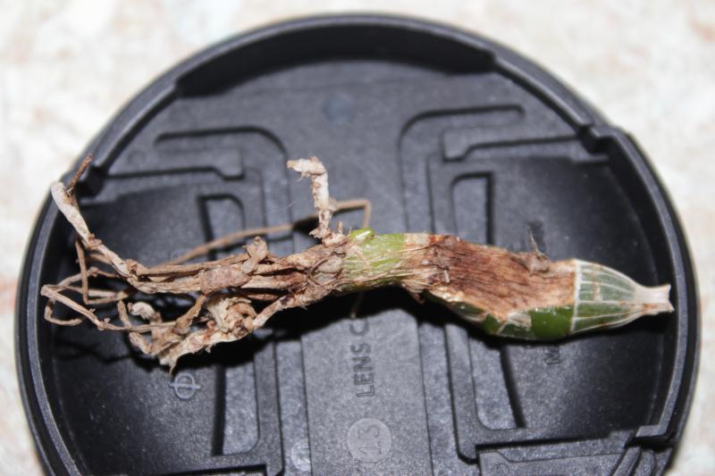 А вот черная малышка, полученная с осенней охоты, так и не уснула, но и роста нового пока не дала. Наращивает массу у бульбы и корешки, и остался один зеленый листик. Она еще может уснуть или ждать молодого побега?