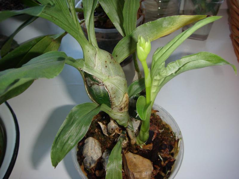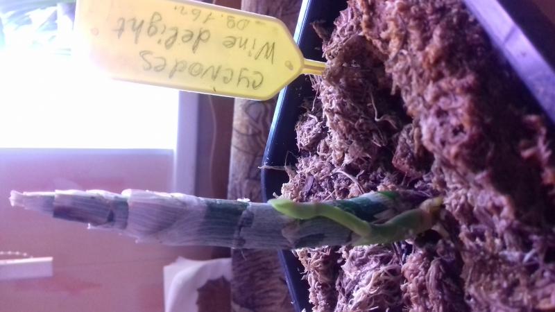 Прислали в сентябре 2016 г из Waterorchids вместо фал.гигантея цикнодес wine delight с надписью "cycn. 001". Думала,росток проснулся раньше времени.Оказалось-цветонос "не оттуда".