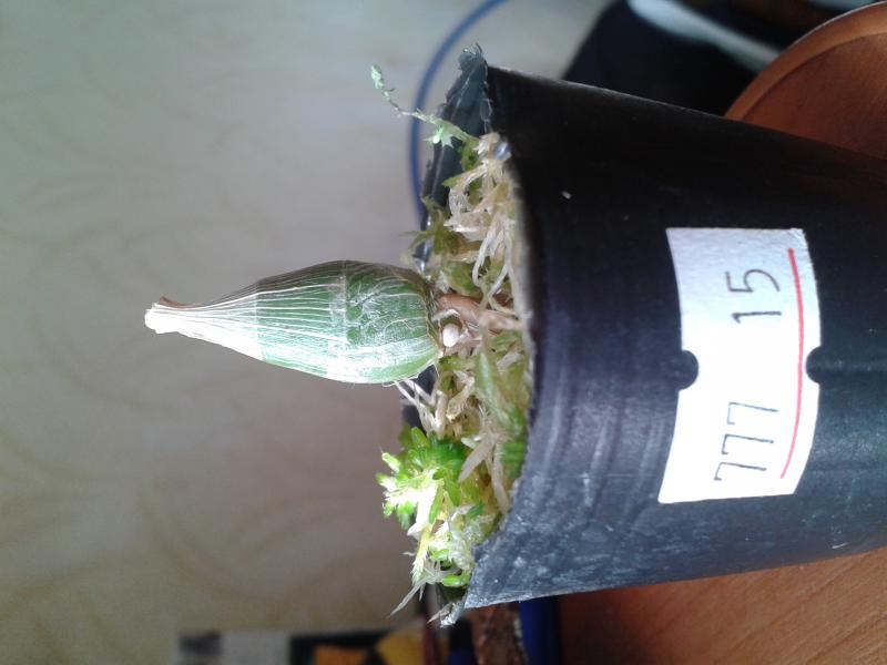 Речь пойдет вот об этой красотуле http://passiflora.club/showthread.php?t=2921&p=551512&viewfull=1#post551512. После получения была пересадка, т.к. попка растения была заглублена в мох, в наличии был живой корешок. Пересадила в прозрачный горшочек в мелкую кору, внутрь пару гранул конского оргавита добавила. Полила по краю горшка. Недели через 2 обнаружила, что гранулы оргавита покрылись плесенью о_О. Сухой листок отпал. Из горшка вытряхнула, положила голышом над водой под лампу в ожидании роста, . Прошло полтора месяца-результат нулевой. Жалко стало морковку, пропадает ведь... В-общем, вчера сердце моё не выдержало, посадила я ее в родной горшок в живой мох.