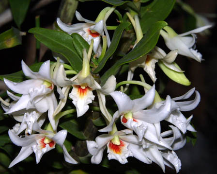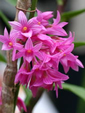 Короткие цветоносы появляются из узлов по бокам псевдобульбы и несут 5-9 цветов. Каждый цветок 1.5-2 см в поперечнике (зато их много, 5-9 цветов из узла... у меня у Нобиле максимум 4). Цветение длится около недели. Сезон цветения - конец зимы и весна.