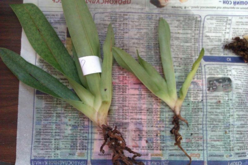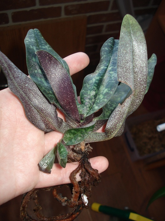 Справа Paph. Maudiae x Paph. Voodoo Magic. Одна нецвёвшая розетка и практически отсутствие корешков.