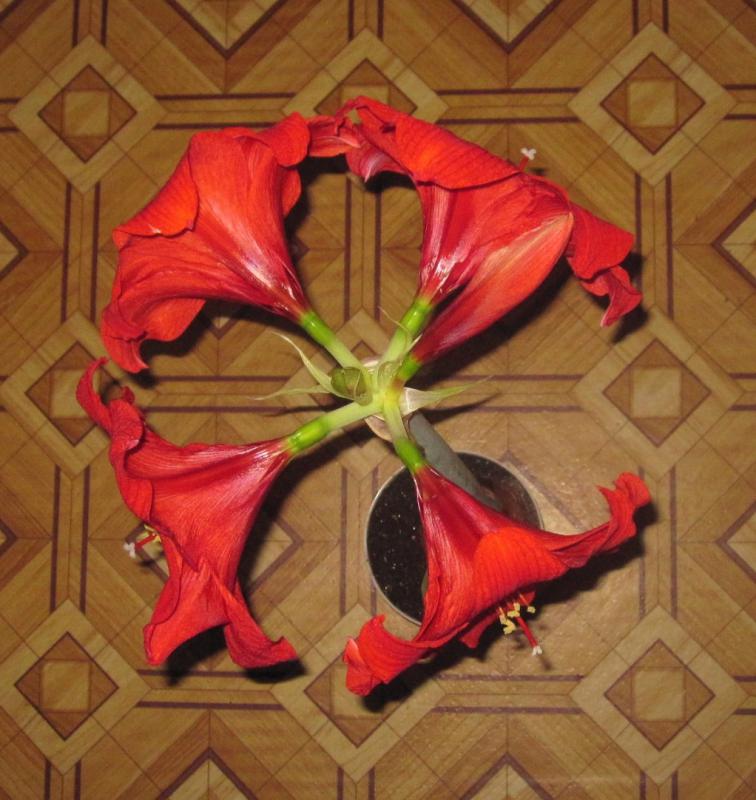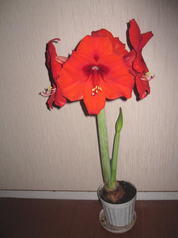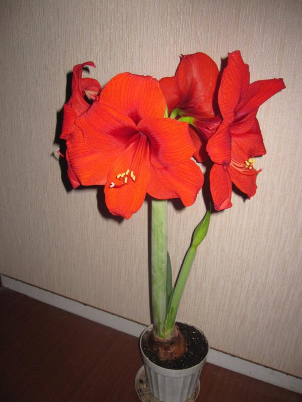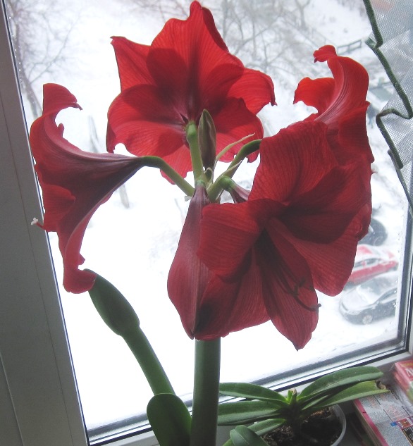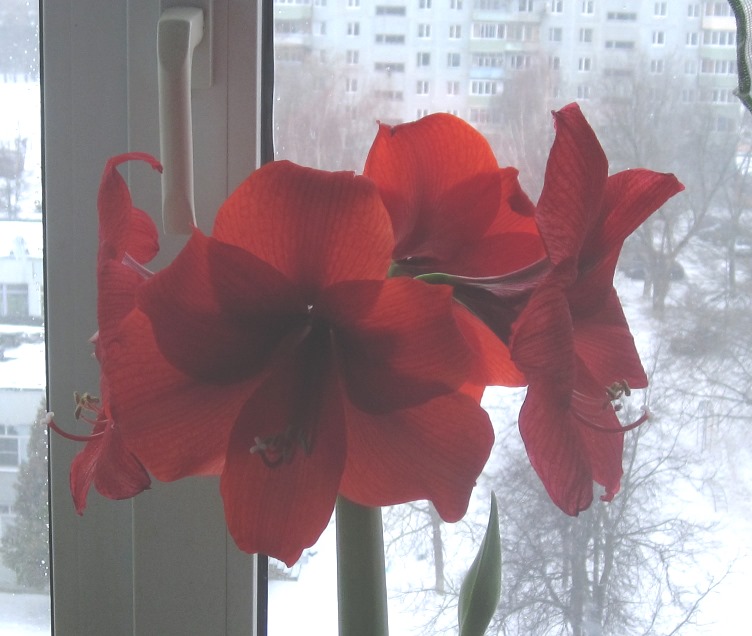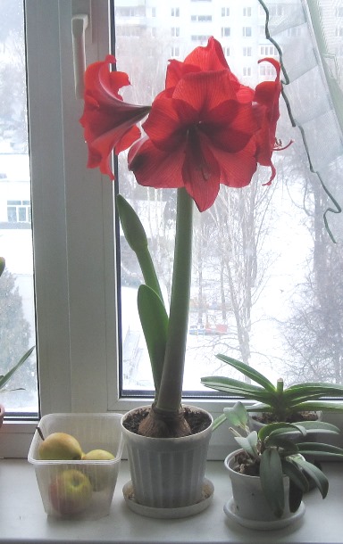 Для покупных не-орх темы нет; цветение не моё, и вряд ли я вправе хвастаться - взял уже со стрелкой, а у гиппа загубить начавшееся цветение трудно, надо постараться. И тем не менее мой №14 - Hippeastrum (предположительно) Royal Red вчера ранним утром, в тёмной прихожей, наспех перед отъездом в Москву.