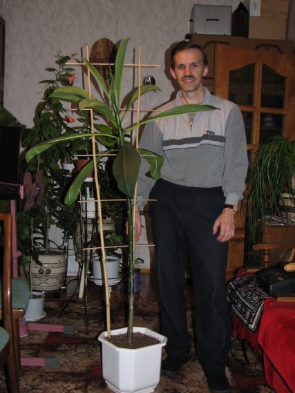 Хочу рассказать о свом опыте выращивания Плюмерии. :) Желтая плюмерия Румба мною была куплена в ноябре 2004 года черенком у TopTropicals.com из США. Черенок был высотой 30 см. Укоренился очень быстро. Пошел расти активно. Солнца у меня нет, но есть подсветка двумя натриевыми лампами по 250вт каждая. Через год моя плюмка ростом стала с моего мужа. За этот год пришлось ее пересаживать несколько раз в горшки по больше, т.к. корневая система у нее очень мощная. И вот появились бутоны... и она расцвела!!!! Но мне пришлось от неё отказатся. Моё мнение - это растение не для квартиры. Т.к. она огромных размеров, хоть я ее и обрезала после цветения. Ее просто обожает паутинный клещик. :girl_brainy: Зимой она выгледит не привлекательной, т.к. почти все листья сбрасывает. Вот так.... :blush::