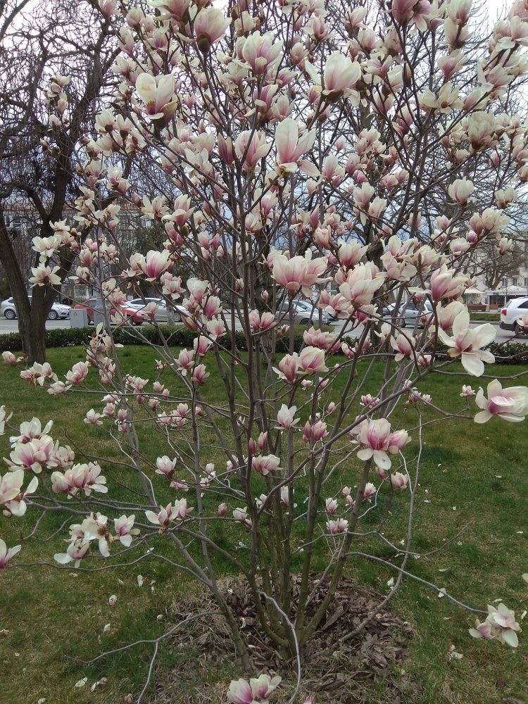 У нас сегодня чудесный солнечный день! На одной из центральных площадей цветёт магнолия! Это совершенно другой сорт, чем на Приморском бульваре! Необыкновенное зрелище!