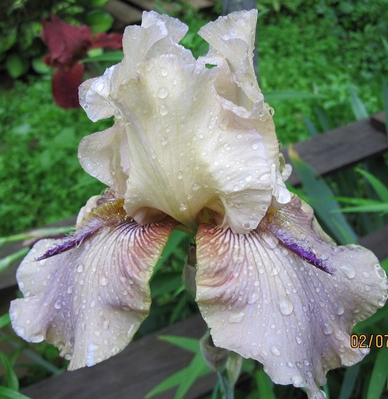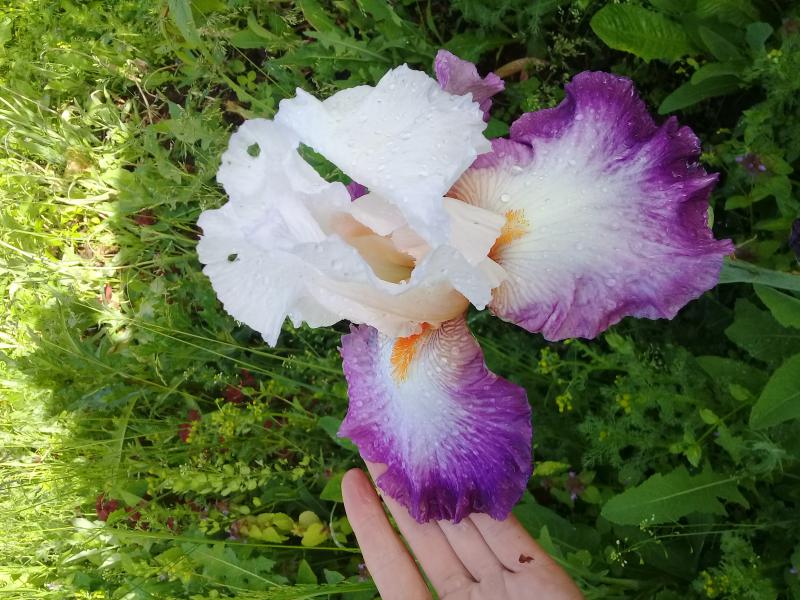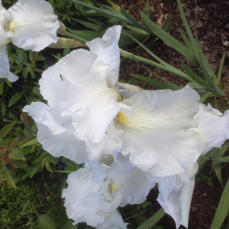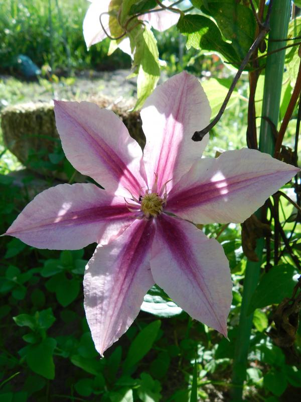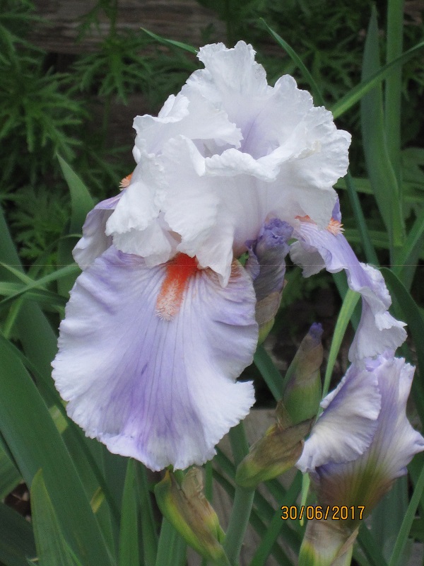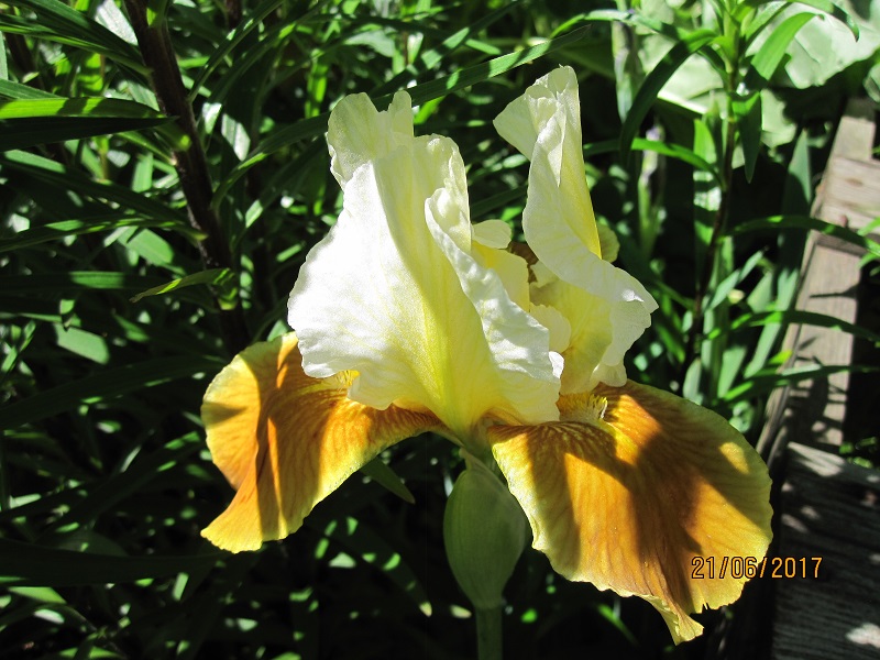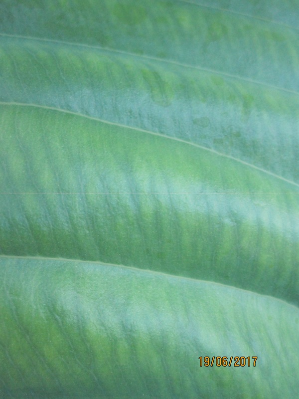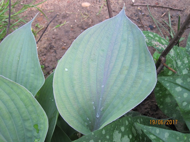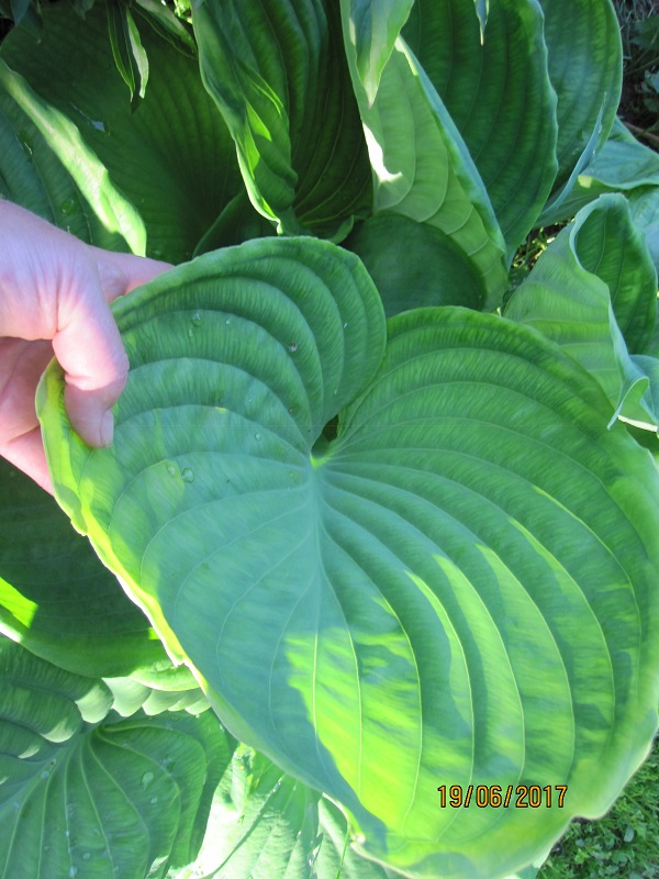 Гигантская хоста с очень красивой фактурой листа, узкий кантик по краю листа весной белый, в разгар лета желтый.