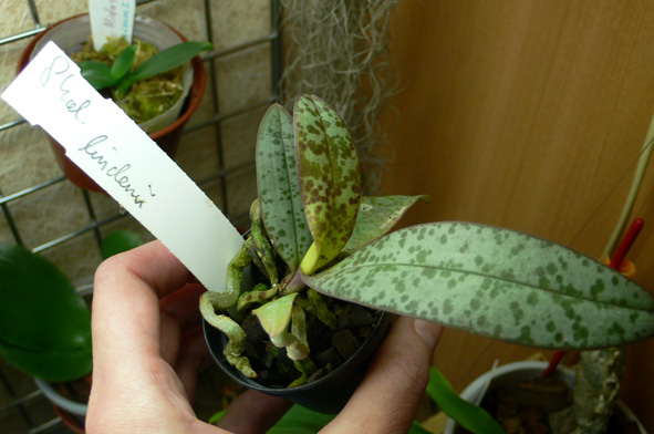 Phal. Lindeni (горшок 5,5) тож красавица, сидит в коре и скорлупе. Попозже может попробую приладить её на блок (буду первый раз тренироваться)