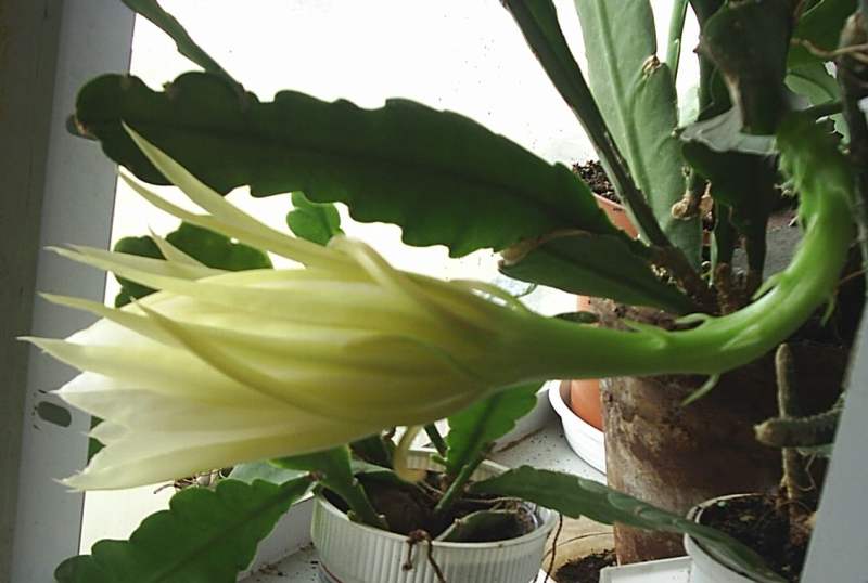 Вот зацветает у меня такой кактус. По зелени - стопроцентный эпифиллум, с довольно широкими и длинными темно-зелеными стеблями. Цветок желтовато-белый, длиной по диагонали 21см от основания завязи до краев лепестков, без запаха. Растение крупное. Воздушных корней на стеблях почти нет. Многие стебли дома растут круглыми в основании и почти по всей длине, хотя света много.