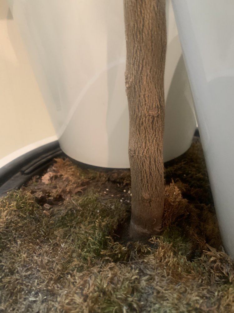 Ствол на фото. Белое кольцо в месте соприкосновения со мхом - скорее соль