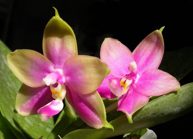 P. Penang Girl x P. Dragon Tree Eagle ""DT168"" (YC 93) по сравнению с цветением в первый день роспуска поднабрал цвет, хотя желтый все равно остался прозрачно-желтым. Второй цветок открылся заметнее розовее первого.