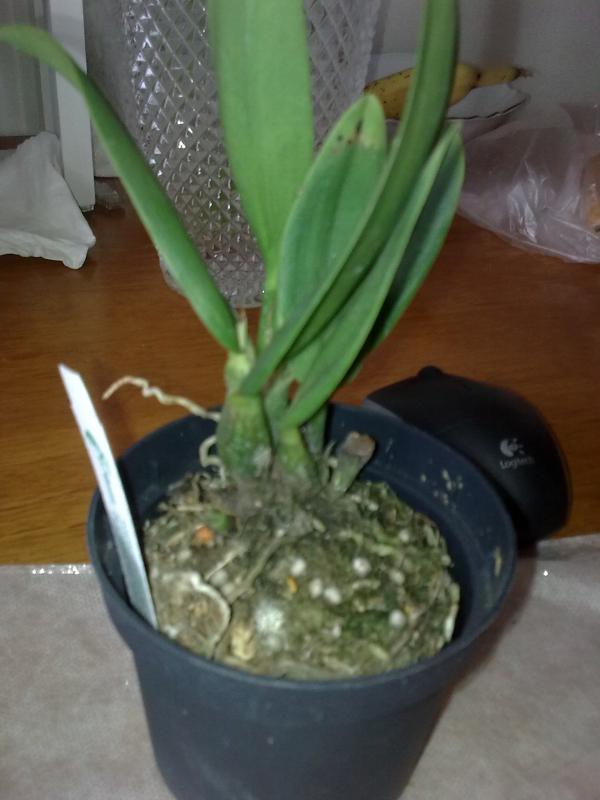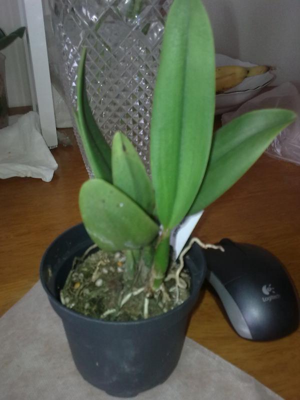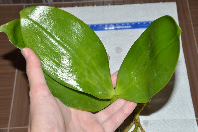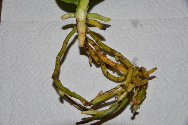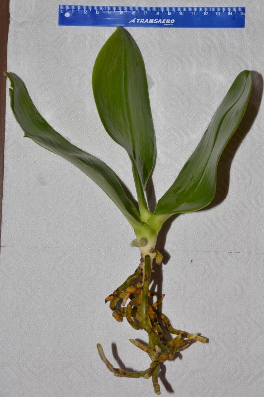 Получила сегодня Phal.Tzu Chiang Chrisna (P.Timothy Christopher x P.Yungho Geld Canary). 3 нижних листа были абсолютно жёлтые, пришлось удалить. На корнях белая плесень, много корней сгнивших, "морковка" вся чёрная и трухлявая, пришлось хорошо зачистить, оставшие после обработки корни тоже с чернотой. На верхнем листике светлые пятна по прожилкам. Наверно опять будет тяжело адаптироваться, у Юченга часто беда какая-то с корнями.