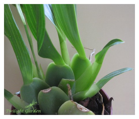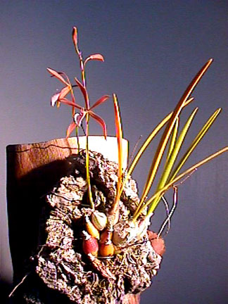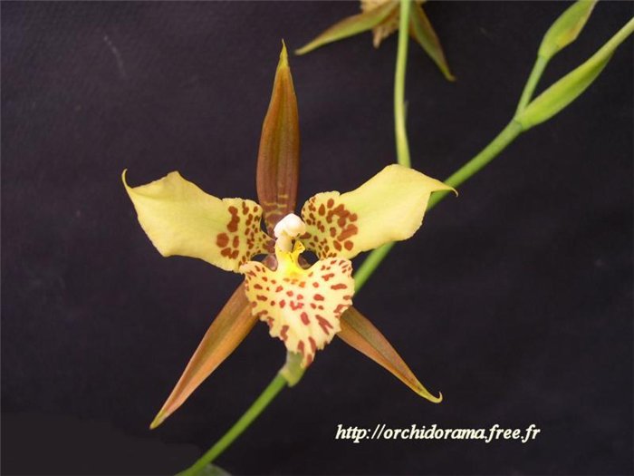 по внешнему виду очень напоминает каттлею. Продолговатая бульба и 1-2 жестких листа, в высоту около 22-25 см., с немного удлиненной ризомой. Цветет с осени до зимы, цветы очень ароматные с эффектной бахромчатой губой.