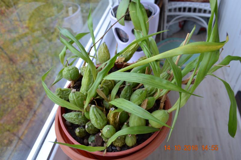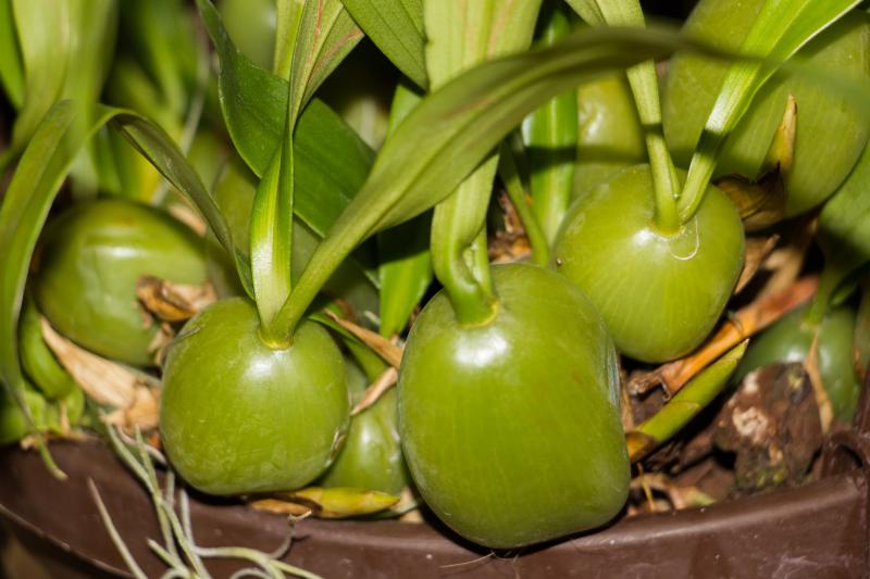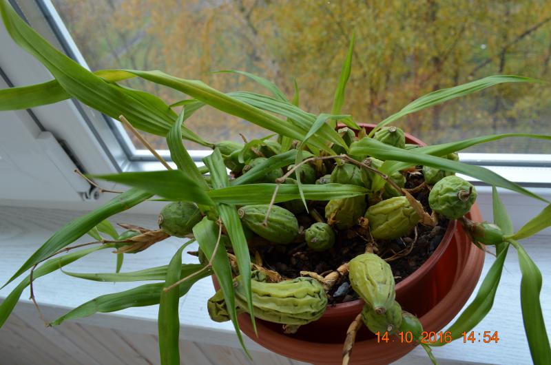 висит на окошке, поливаю не часто и уже не кормлю. У оснований бульбочек видно почки, но они пока расти не собираются.
