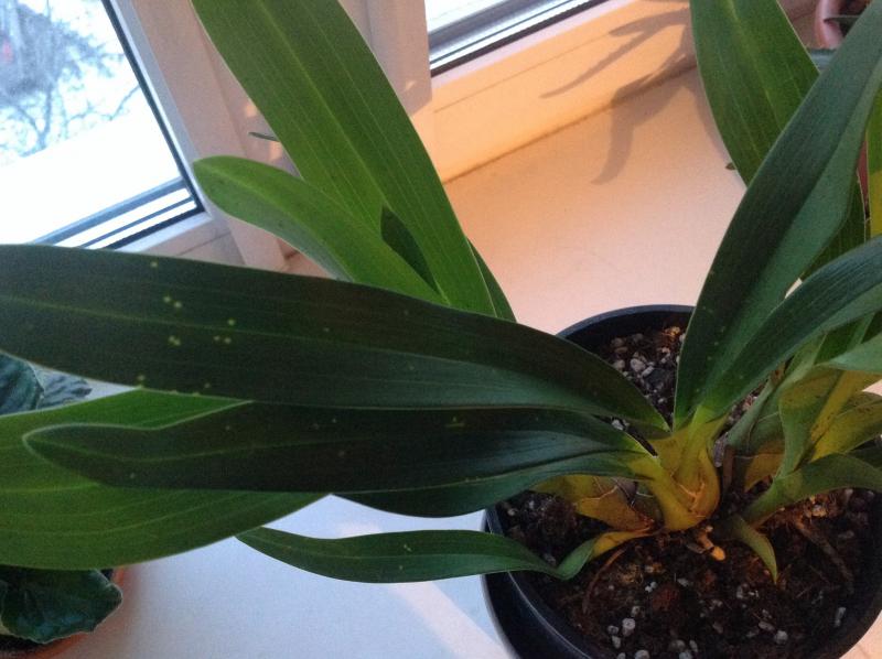 Получила сегодня цимбидиум, на листьях прозрачные мелкие пятнышки.
