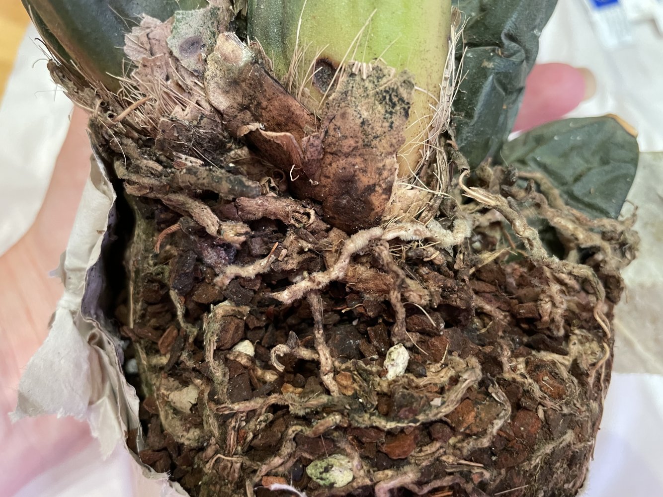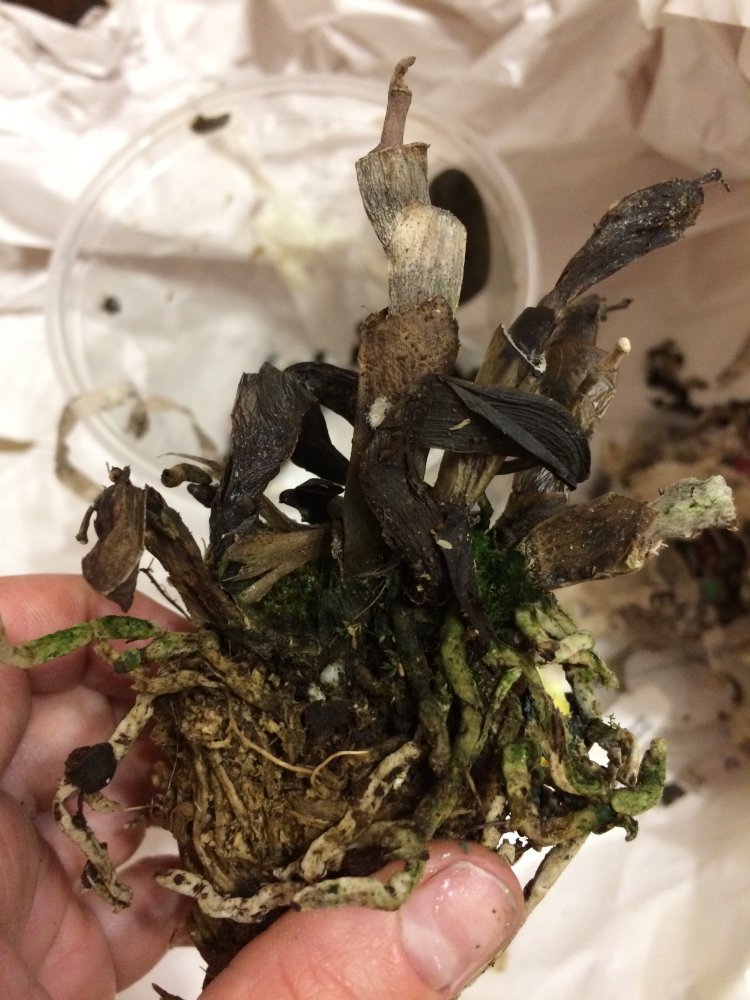 Жирненькие бульбы, вопрос к одной, там пятно. Наметился рост, но сопрел. К корням вопросы - есть ли живые. В целом довольна.