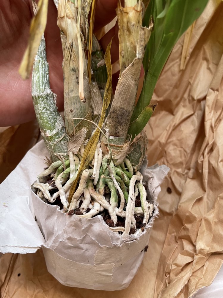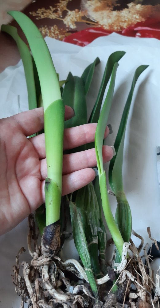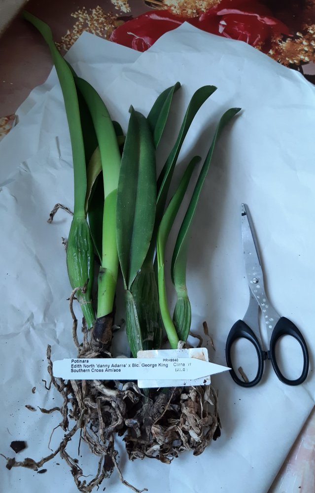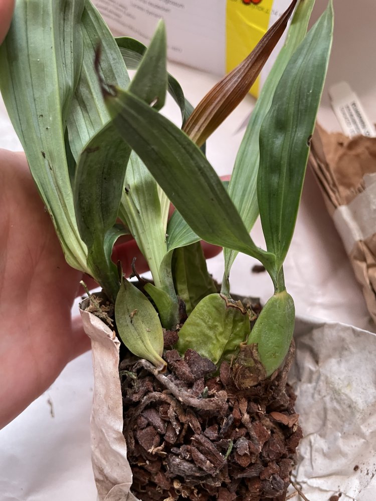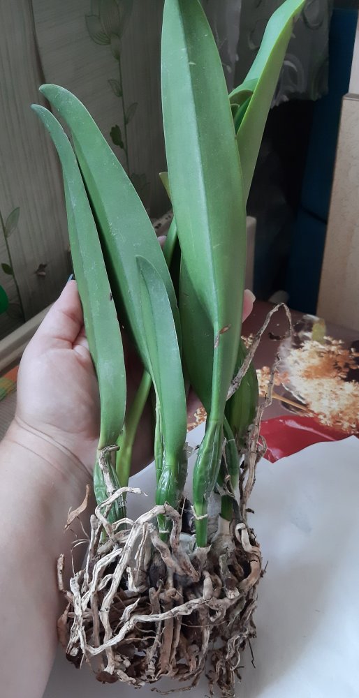 1). Cattleya iricolor - супер растение, взрослое , без пятен на листьях, один рост с чехлом, 3 молодых новых роста. Корни сухие, но для адаптации их должно хватить.