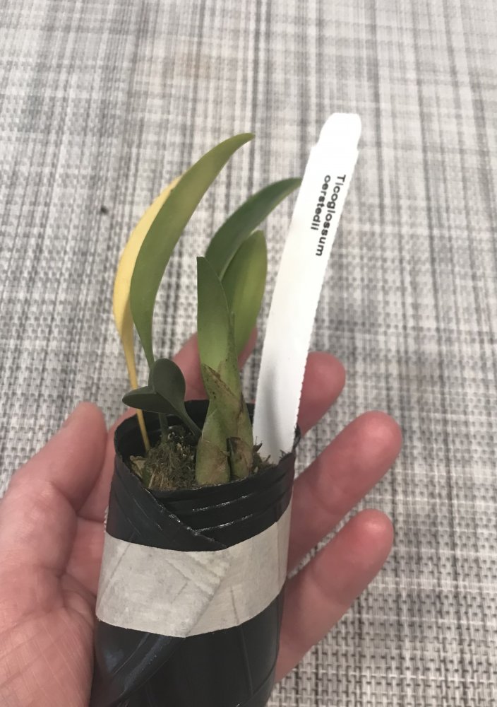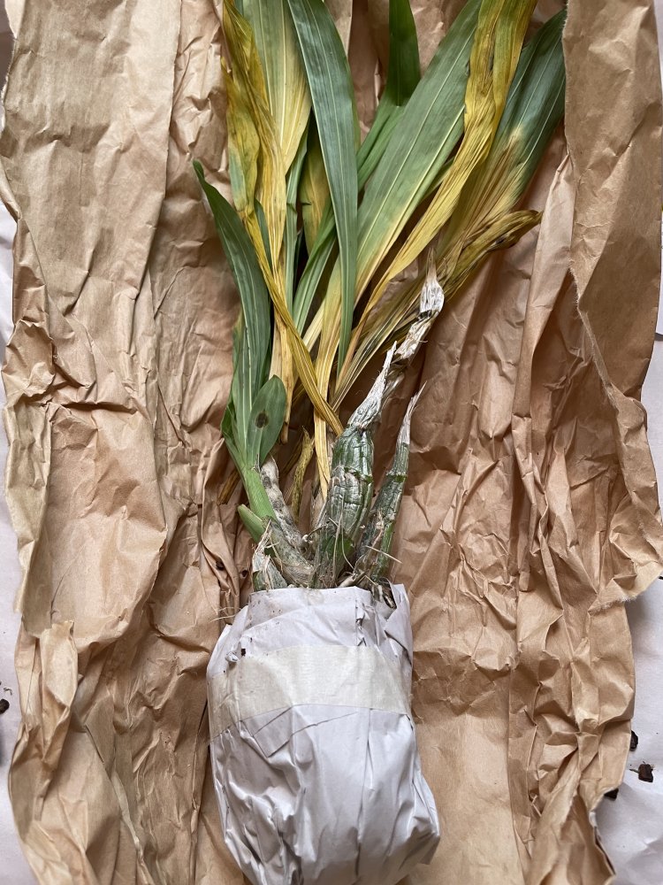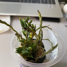 5). masdevallia Confetti - взрослое просушенное растение, большая часть листиков отсутсвует, из оставшихся парочка уже сухие и желтые.