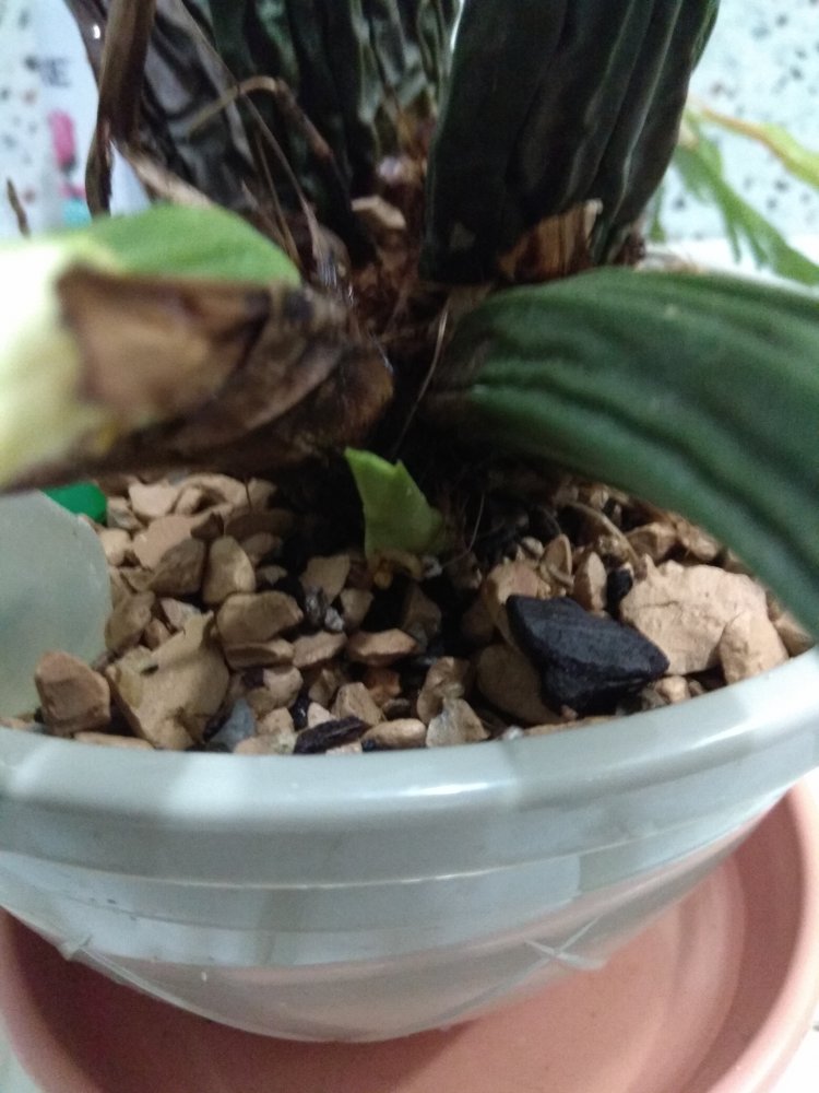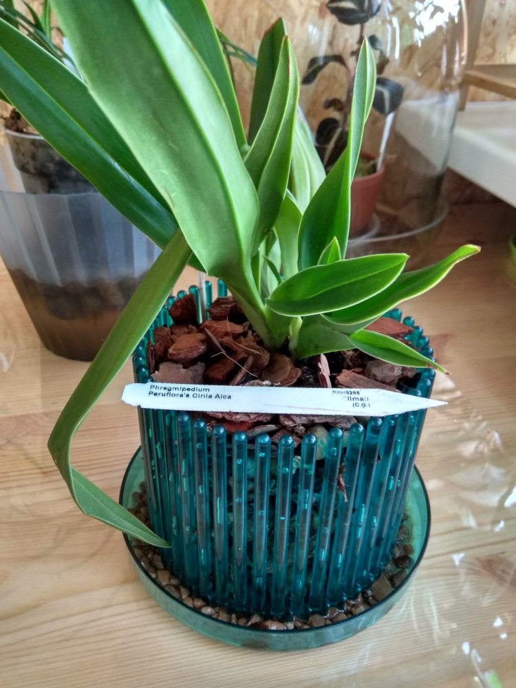 1. Phragmipedium Peruflora's Cirila Alca - самый сложный для меня и капризный. Любимое занятие - выращивать белую пушистую плесень на поверхности грунта. Неоднократно пересаживался и обрабатывался, но на все найденные в интернете варианты посадки, он реагировал одинаково. Не помогало ничего - ни перфорация горшков, ни уголь, ни смена места, ни пребывание на свежем воздухе... Сейчас сидит в "короне" в смеси из сосновой коры, с кокосовыми чипсами, углем и керамзитом, на дне - немного лавы. Плесень вырастить у него сейчас не получается, но я, прям, физически ощущаю исходящий от него скепсис ) Состояние у него, по моим ощущениям, за это время не ухудшилось, но одну старую розетку он всё же съел.
