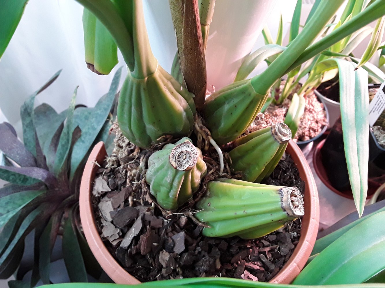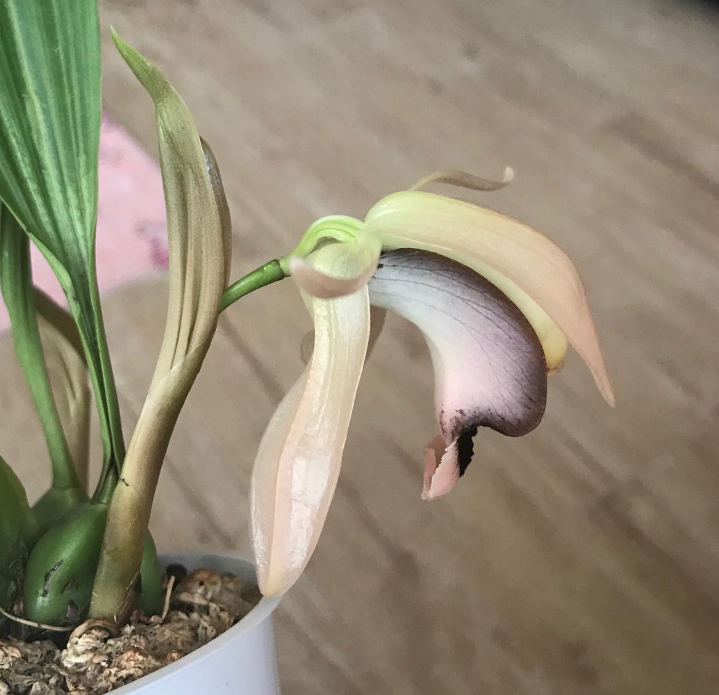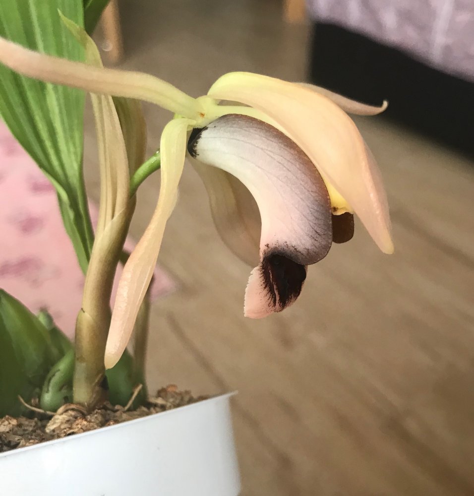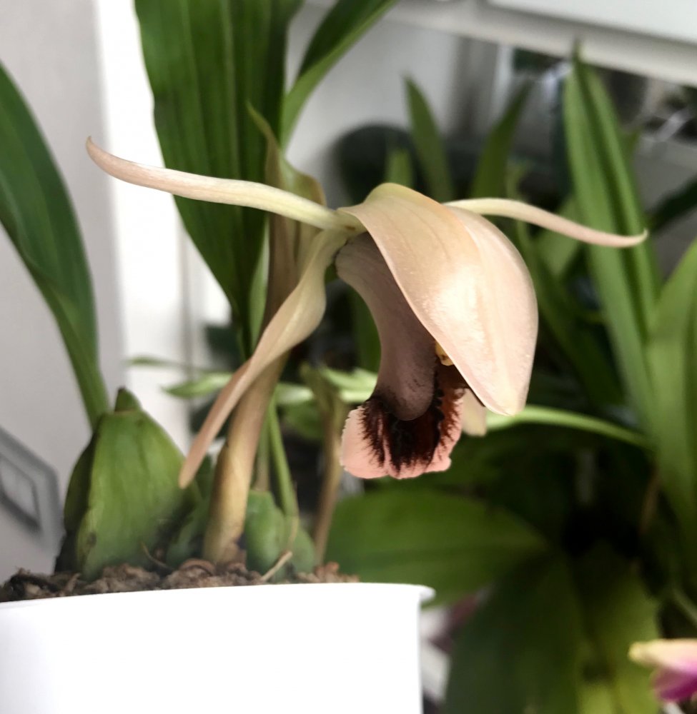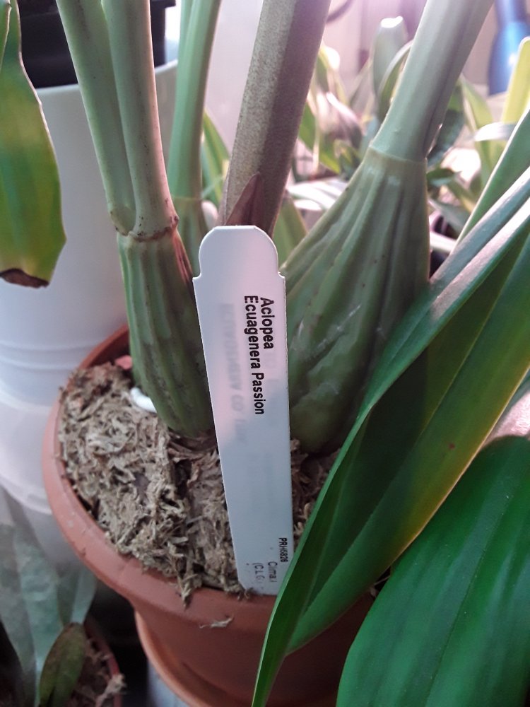 И у меня такая же лошадка с осени - гибрид ацинеты на стангопею - ациопея называется)). Даже цветонос сразу выдала, но не дорастила, отсушила. Слишком сухо и жарко этой зимой было. Бульбы с кулак, листья по пол метра... Но растение сразу огромного размера приходит, выращенное. Адаптация только долго проходить будет...