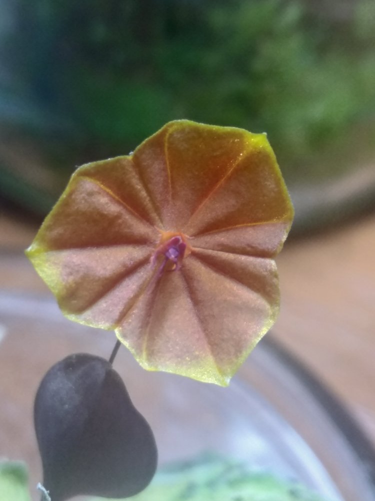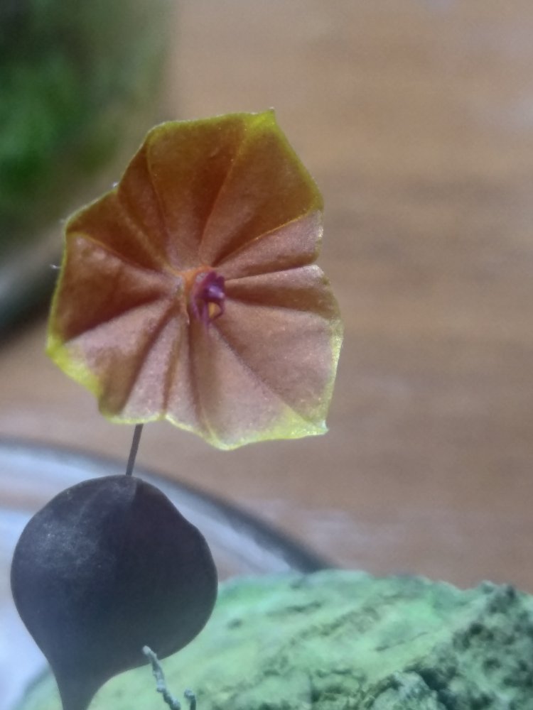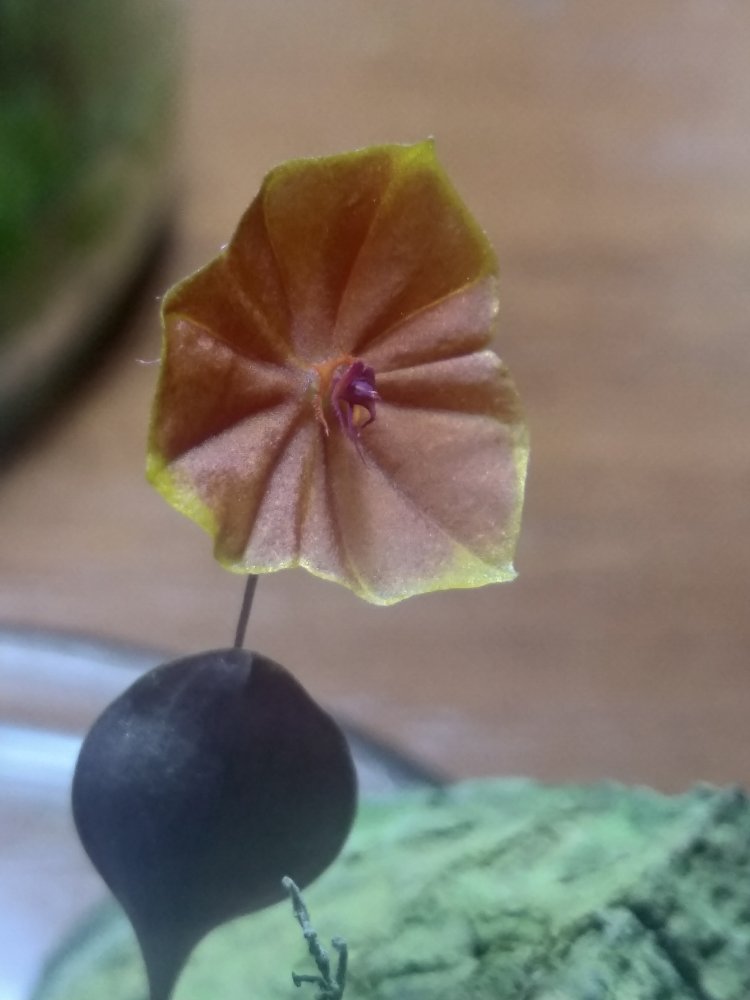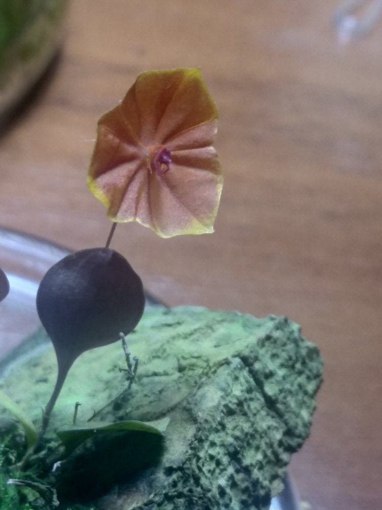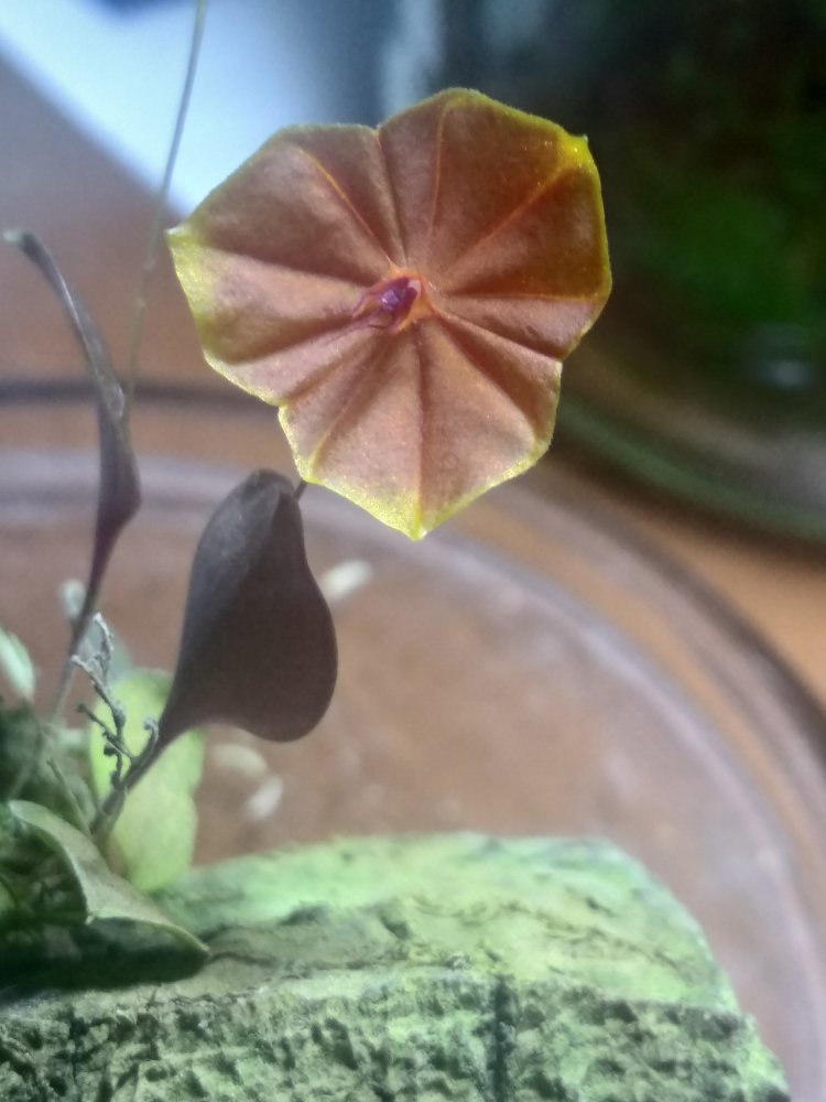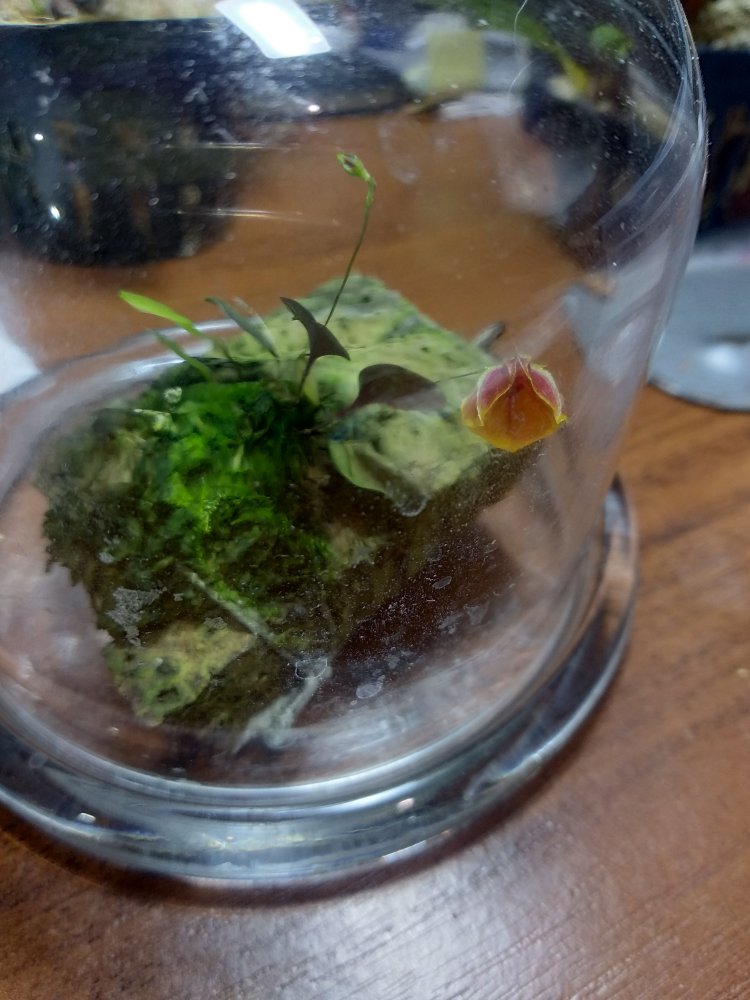Lepanthes telipogoniflora получен в этом году. С момента получения нарастил 3 листика, один цветочек уже раскрылся, дует еже один бутон. Живёт в том же стакане что и пришел, только накрыт стеклянным колпаком. Поливаю в последнее время водой из аквариума. Если честно боялась что загублю.