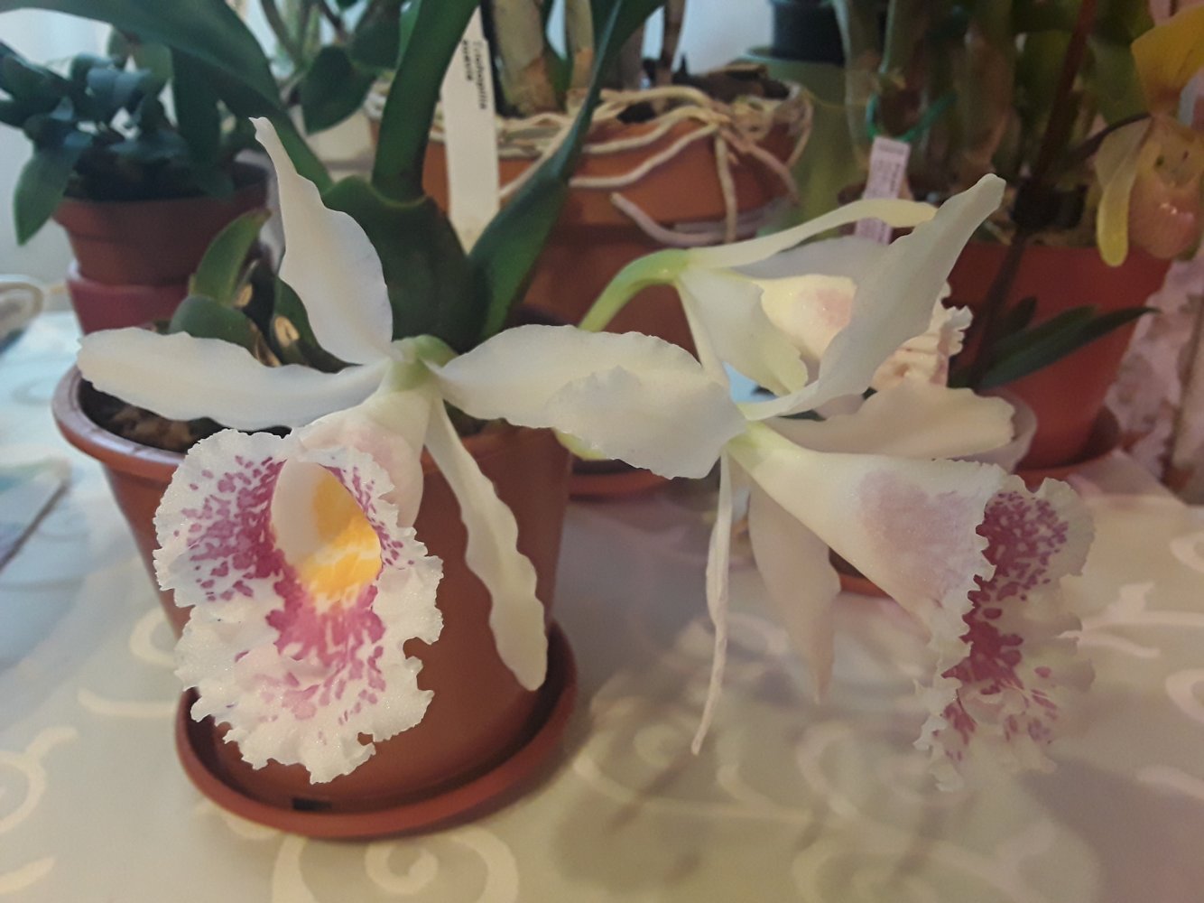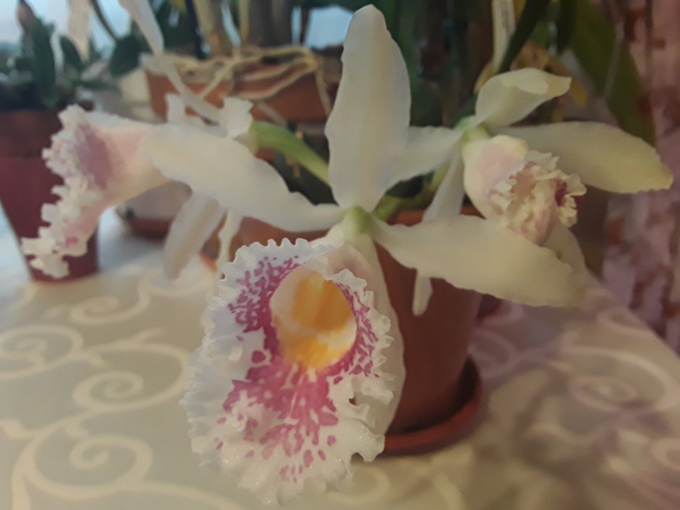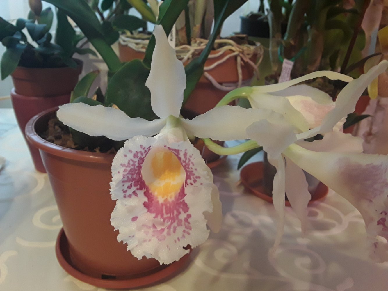Ну и у меня долгожданное первое цветение Trichopilia suavis, полученной весной 2019 от этого поставщика. Вчера еще была с бутонами, сегодня цветы до конца не раскрылись, но, как говорилось в известном мультфильме, держаться нету больше сил)). Поэтому покажу сегодня в этой теме, а как раскроется полностью - в теме цветения)). Уже слышится медовый аромат. Насколько помню, он должен быть ярко-цветочный, сладкий, так что подожду. Также как и другие сильноароматные орхидеи, увы, цветение этой красотки продлится совсем мало - около 5 дней (плюс - минус день или два). Да, цветы для такого размера растения очень крупные, сравнимо с многими каттлеями .
