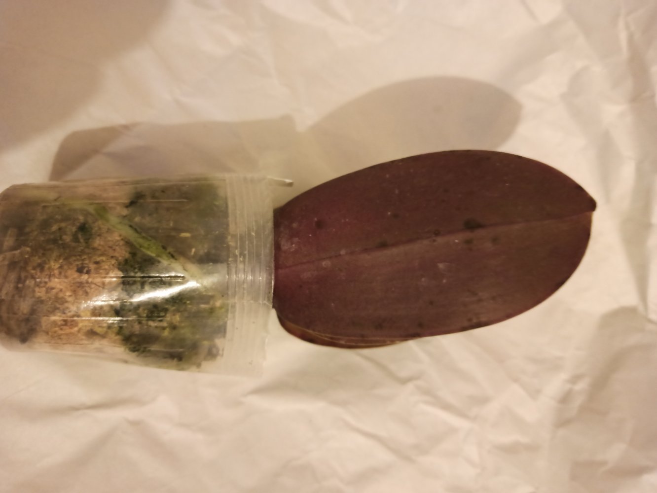 Первый пациент, на сколько помню, пришел с такими точечками на нижнем покоцаном листике изначально. Точки не растут, вроде не распространяются. Сидит в родном мху, хочу пересадить в серамис (мало места ему уже, новых листов не дает, мох уже дохлый). В общем, грустит как-то. Товарищ от Джоя, ощущение что спит, новый лист не растит. Но корни идут в рост.