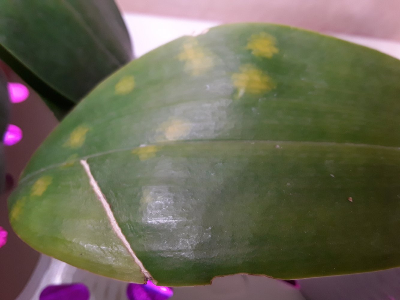 @lin265, у меня были такие пятна один раз. Получила phal joy spring canary orange из старого заказа, тогда было доращивание. На одном листе были такие пятна. 1-2 месяца разрастались по листу, потом затормозились. Ничего не делала, просто следила. Поначалу растение тормозило, потом пошло в рост. Как только позволила новая масса, я подозрительный лист отрезала. С растением все нормально. Новые листья растут здоровые. Не знаю, что это. Возможно на доращивании обрабатывали какой то химией, и пошла такая реакция. Сложно сказать.