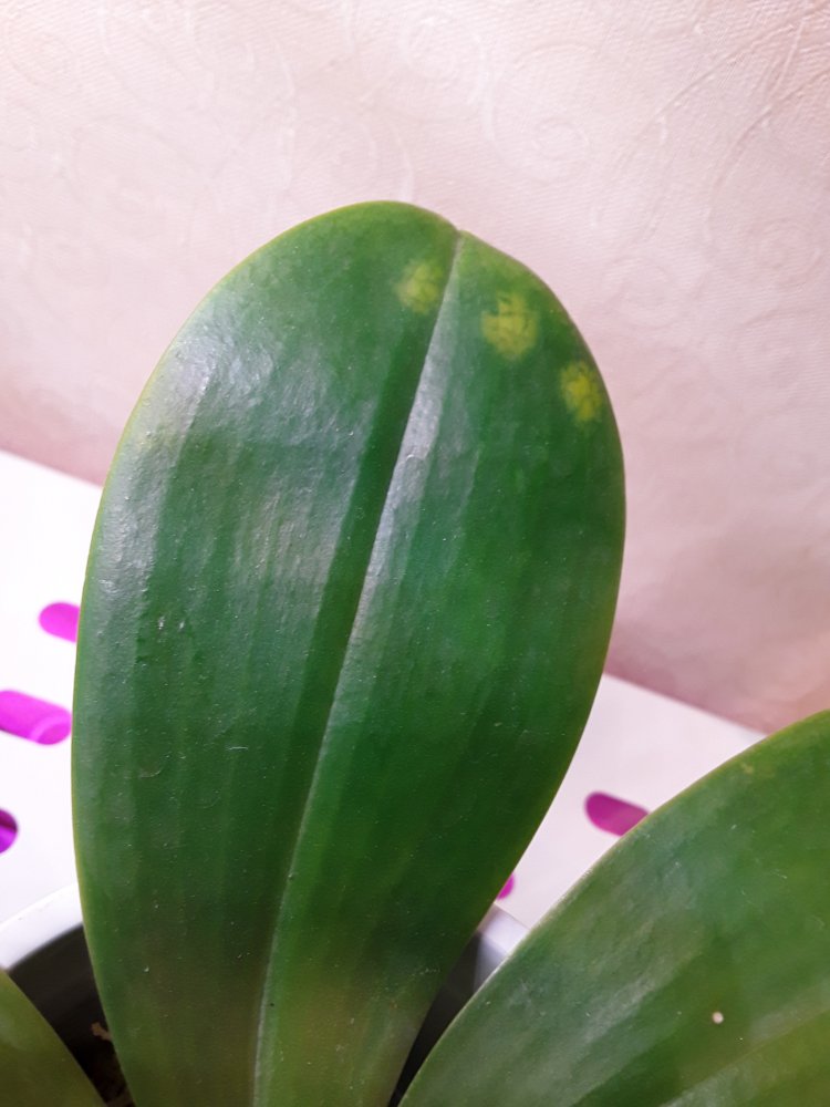 Пррошу совет с определением пятен на листьях фаленопсисов. Летом получала одновременно очень дорогие фаленопсисы от Миту из разных старых спецов. Все пришли взрослые, отличные, цветшие. Ничего с ними не делала, как получила, так и растут. Корней новых море выросло, по 1-2 новых листа, все сейчас дуют бутоны. Но на 3 разных фаленопсисах именно из этой партии (причем, стоят все в разных местах, отдельно друг от друга) практически одновременно появились желтые пятна и они прогрессируют. Именно не разрастаются, а появляются новые - желтые круги. Начинаются от края и потом продвигаются в сторону центра. Вредителей никаких нет, следов от них на растениях тоже. Чернота потом на этих пятнах тоже не образуется, хотя от грибка на всякий случай обработала Строби, но результ нулевой, продолжают появляться. Думала хлороз, обрабатывала препаратами с железом - результат снова отрицательный. Соседние фаленопсисы без таких пятен.