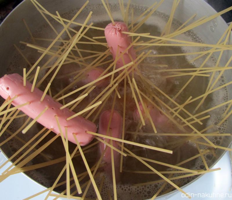 Берем сосиску и пачку спагетти. Протыкаем сосиску 30-40 спагеттинами и аккуратно помещаем в кастрюлю с кипящей водой. Варим до готовности: