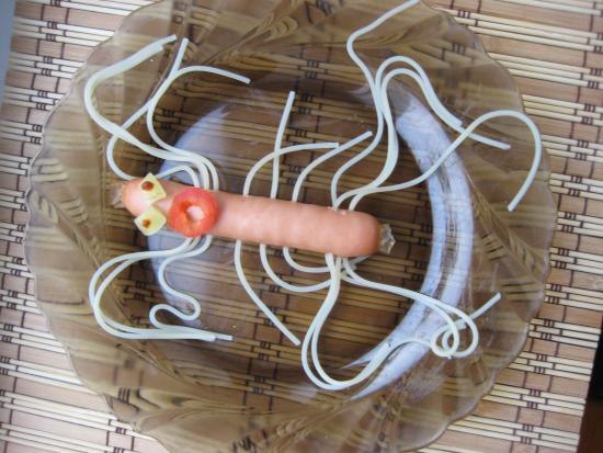 Интересно наблюдать реакцию гостей на такую вареную сосиску с гарниром из макарон... :)):