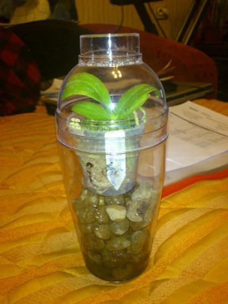 Думала я почти сутки, а смастерила за 15 минут. берется две крышки из под тортов, одна из них чуть меньшего размера. Большая служит резервуаром для воды. А в крышке поменьше прорезается отверстие равное размеру пластиковой разрезанной 5-литровой бутыли из под воды. Также в этой же крышке я протянула тонкие 0,5 см полоски из разрезанных колготок для крепления орх. Затем все детали собираем как конструктор. На ночь верхнюю часть снимаю.