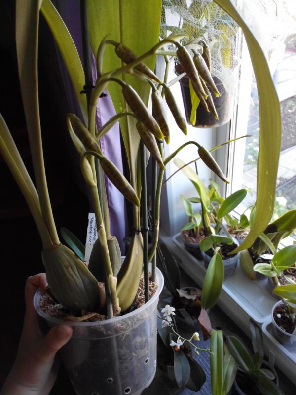 Обязательно покажу его цветение, он уже цвел в теплице, есть пеньки от цветоносов. У меня впервые, поэтому очень интересно. Растение, конечно, крупное.Rossioglossum Rawdon Jester 'Munchner Kindl- это первое цветение?