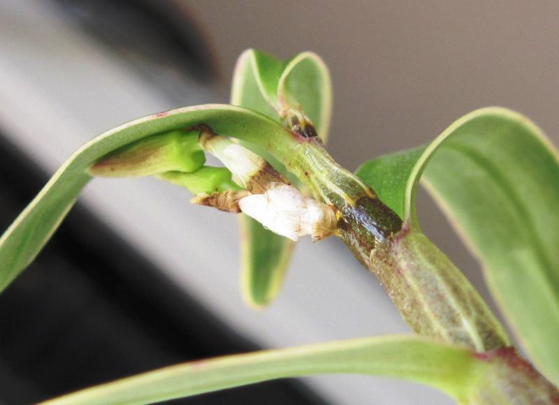 Вариегатный Dendrobium monile Albomarginatum от Карге наконец-то, через год после получения, порадовал двумя бутончиками)) Маловато конечно, но я так поняла, что это вообще необильно цветущий дендр. У всех на фото цветочков немного.