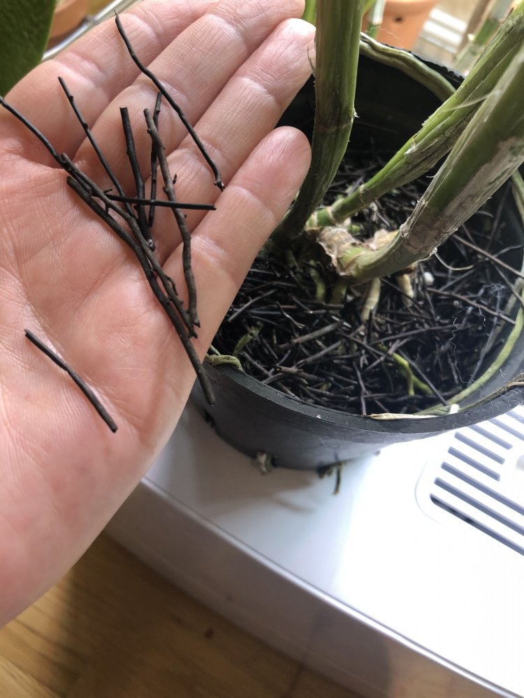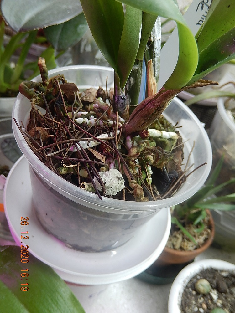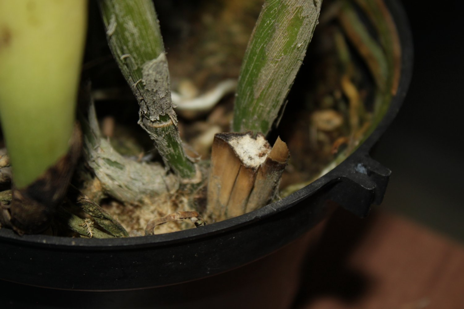 Сейчас при осмотре заметила, что таких пеньков имеется в большем количестве: на фото видно такой обрубок на переднем плане. Другие были обрезаны практически под уровень субстрата... Вопрос к специалистам, что делать. Хотелось бы зачистить ризому от этих гнилых ростов. Но стоит ли? И вообще новые росты уже достигли краев горшка, то есть, по идее, надо пересаживать в новый горшок, иначе следующие росты окажутся за пределами горшка(если каттлея доживет до тех пор). Если пересаживать, то уже предвижу проблему с вытаскиванием из горшка. Корни в несколько рядов присосались сверху по всему периметру горшка(( То есть придется их рвать. Как поступить?