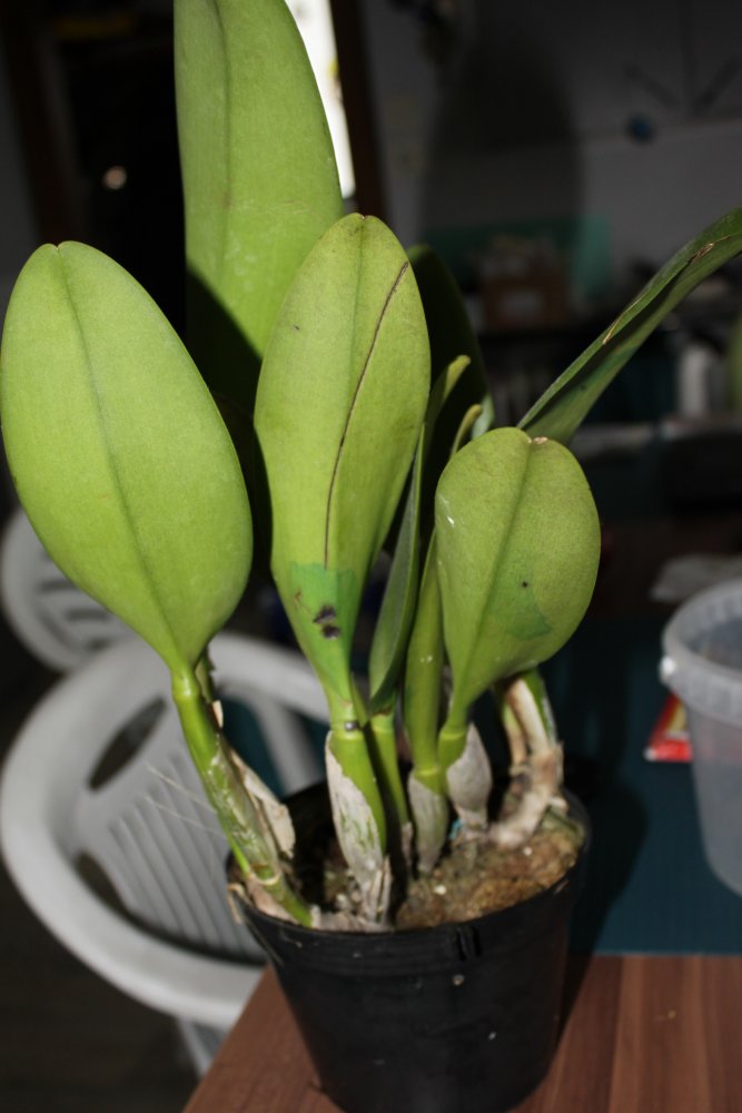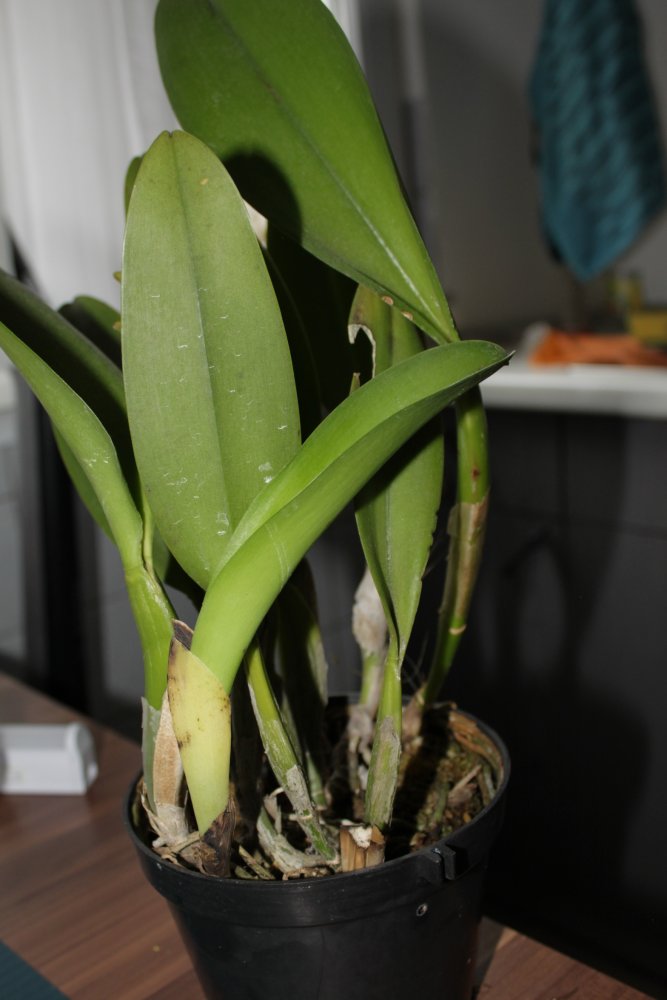Вчера ко мне приехала полученная два месяца назад каттлея Spanish Eye. Все это время за ней ухаживали родственники, как могли. Без достветки и при слабом освещении в условиях обычной московской квартиры. Пришла с одной черной бульбой, по словам родственника была еще одна, обе он удалил по моей просьбе.