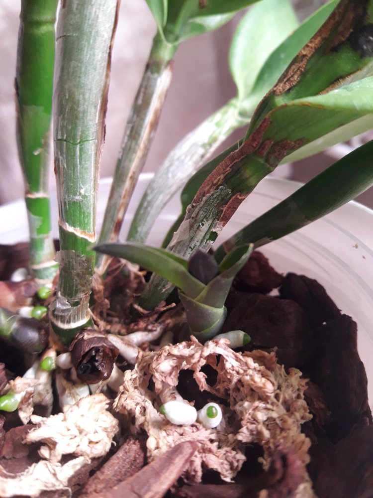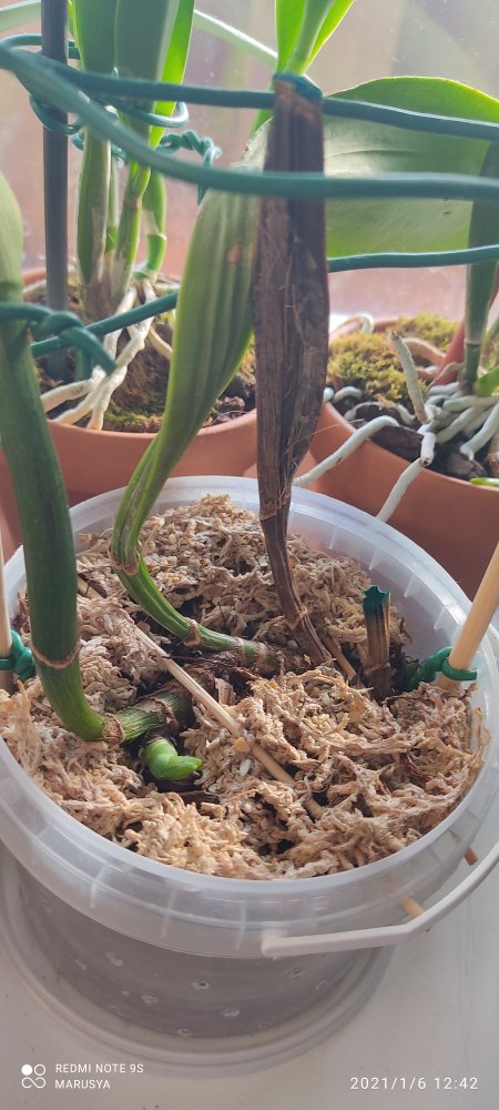 @Маруся_666, пока можно понаблюдать. Чернота в основании ростика - самый нижний кроющий листик почернел, можно его аккуратно снять. Бульбы отмершие больше похожи на съеденные самим растением, пока тоже можно не трогать, если сухие и не гниют нигде. Ну а дальше будет видно, как расти будет...