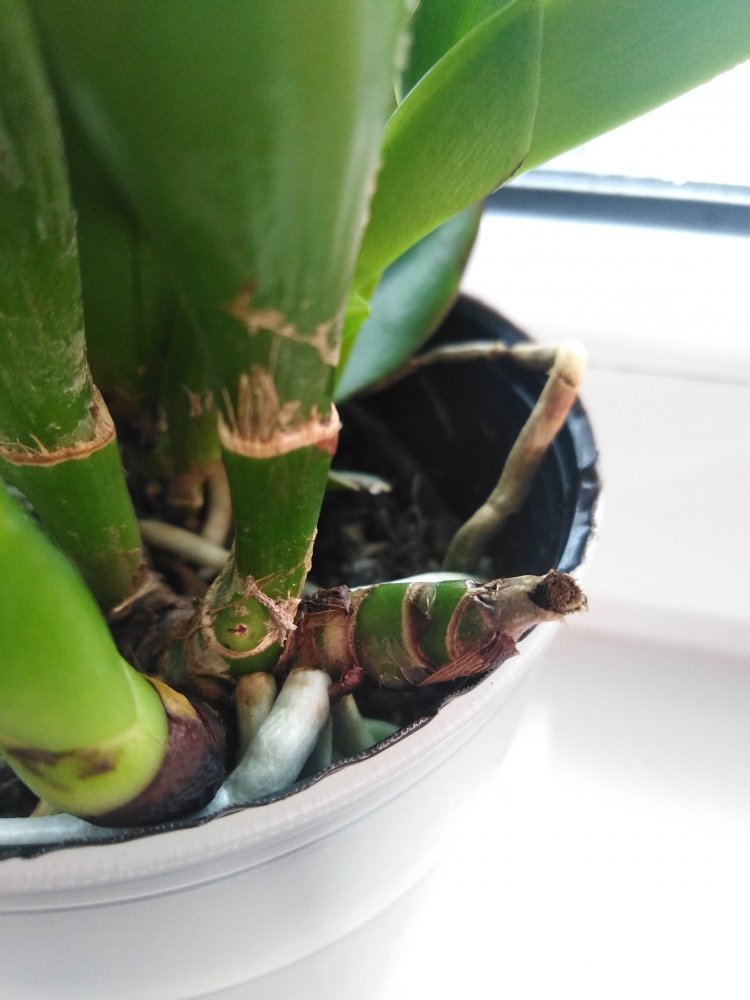 @Маруся_666, ну тогда срезайте. Раз верхний листик почернел - все, рост в процессе гибели. Срезайте с омершими бульбами ризому до здоровой части. Срез одной зеленкой мало обработать. Если была та самая каттлейная гниль - ее более менее только Максим останавливает, зеленка нет. Растение, конечно, вцелом уже исхудавшее, из последних сил растет, может и не вытянуть новый рост...