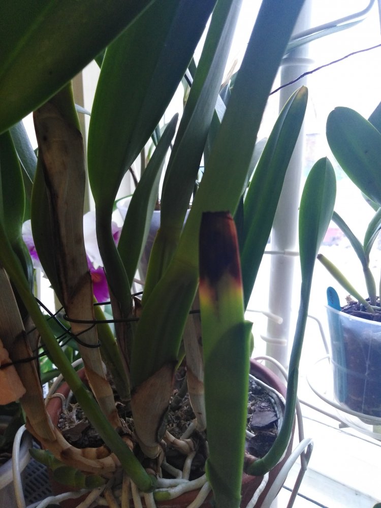 Добрый день. Расскажу свою историю. У пары моих каттлей стали чернеть молодые росты, поливались иногда из-под крана, а в основном осмос + удобрения ( в зависимости от состояния растения ), вычитала, что это недостаток кальция, провела несколько обработок удобрением брексил Са ( кальций ) и рост нормализовался. Вот первая, этот рост полностью почернел IMG_20210106_120646.jpg следующий рост тоже начал чернеть, начала обработки, чернота остановиласьIMG_20210106_121043.jpg третий рост уже чистый IMG_20210106_121109.jpg вид растения целиком IMG_20210106_121439.jpg