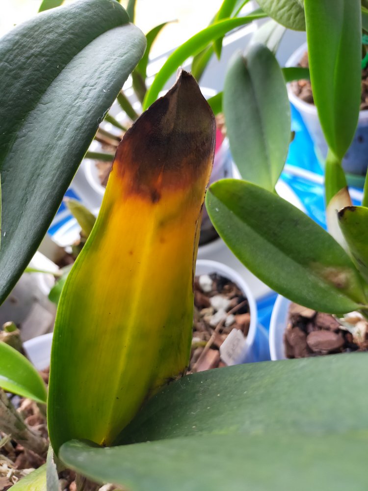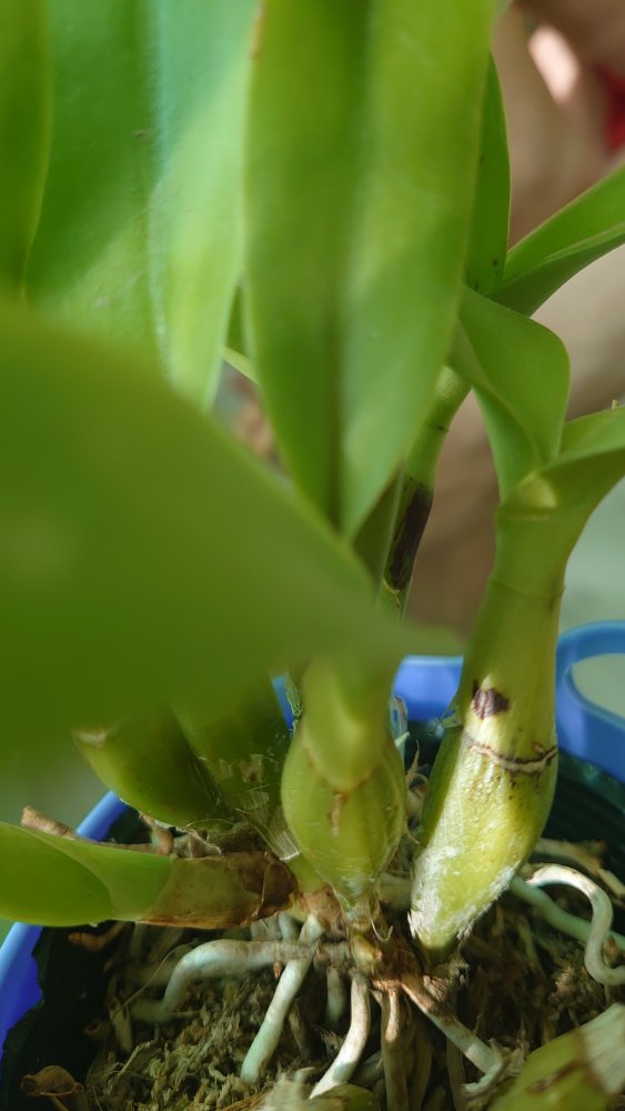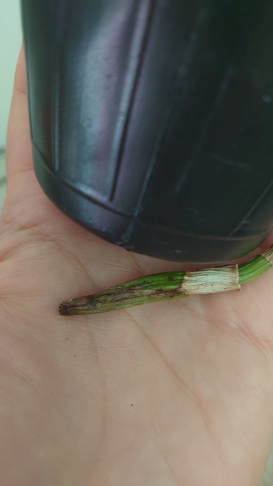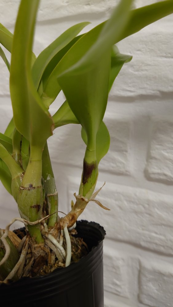 Вы про пятно на этом росте(справа)? Бульба отвалилась с задней части@Lazuriya, там на одном фото на новом росте под кроющим листом черное пятно. Снимите этот сухой кроющий лист и сфоткайте эту бульбу. Пока ничего другого, что могло бы вызывать беспокойство, не вижу. Задние бульбы отмерли, корни от них значит тоже. Вся зеленая часть выглядит хорошо и здоровой. А откуда отвалилась бульба, с ззадней отмершей части или с передней молодой?