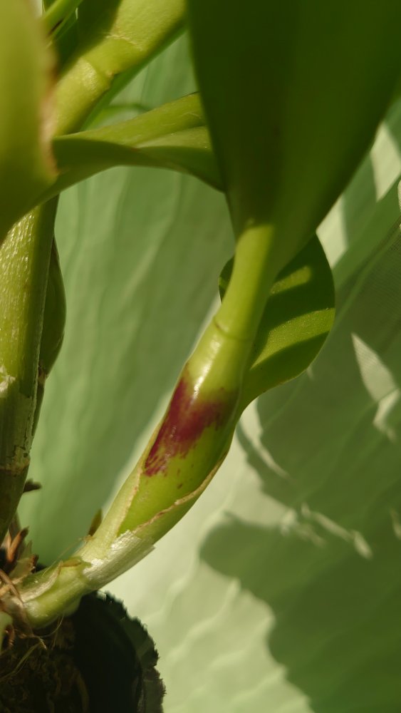 Пятно фиолетовое. Камера цвет изменила. На новом фото лучше видно. Несколько пятен другого рода на соседней бульбе. Место, откуда отвалилась старая бульба не получается хорошо сфотографировать. Очень глубоко. И рядом старые бульбы, хоть ещё и зелёные. Вытаскивать и разгребать?@Lazuriya, да, про это пятно. С одной стороны, оно точно по контуру бывшего кроющего листа - так загар проявляется. Но он либо фиолетового, либо бордового цвета. Пятно, насколько смогла разглядеть коричневого. И больше ни на каких бульбах таких пятен нет - это тоже не характерно для загара, если уж появляется, то на всех...Не нравится оно мне... Наблюдайте за ним, как бы расползаться не начало. Я б его Макисмом замазала. И заодно наблюдайте, не будут ли где пояаляться аналогичные на ризоме, на бульбах и на листьях. На втором фото - я правильно поняла, это место, откуда бульба отвалилась? тоже плохо видно, но по мне, так там ризома почернела и следующий зеленый рост от основания тоже.