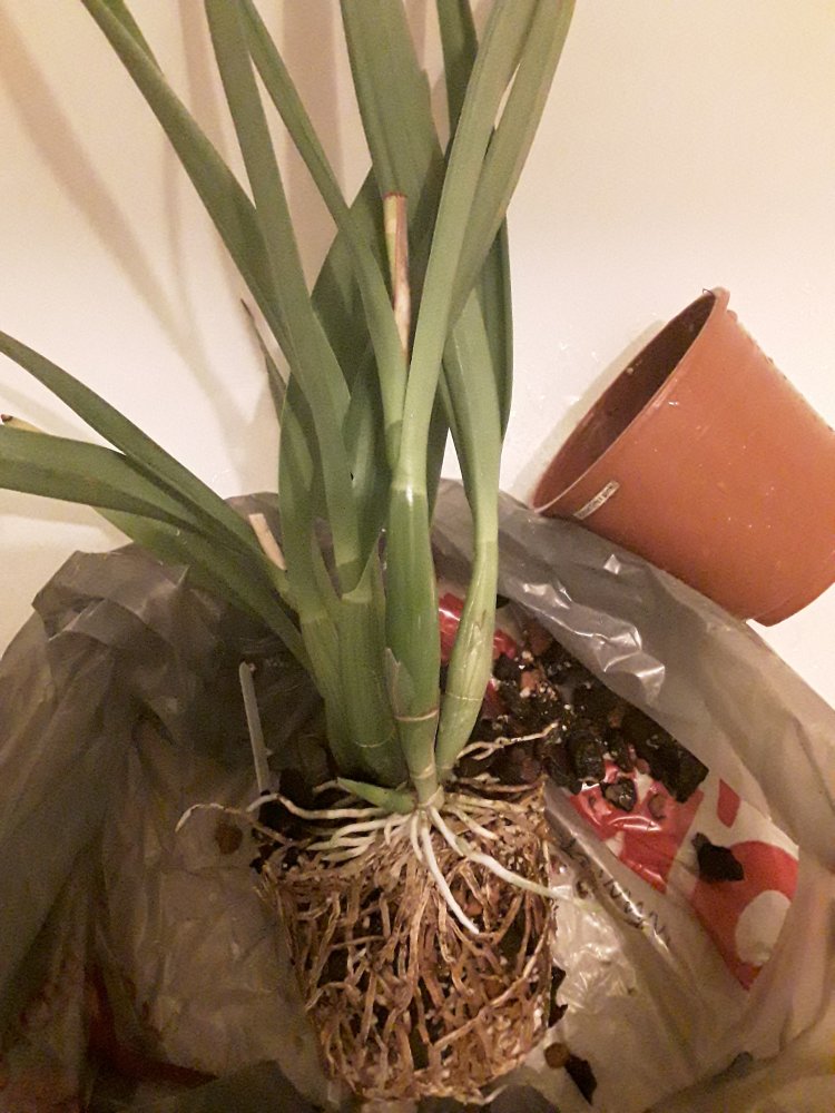 Решила тоже сегодня пересадить одну давно домашнюю каттлею - гибрид энциклии и каттлеи, все руки до нее не доходили. А между тем, корни от последнего роста уже все снаружи горшка торчат, явно им не комфортно, потому что через время перестают расти. Отцвела она в октябре и сейчас снова пошла в активный рост. Периода покоя у нее нет, растит по 2 псевдобульбы в год. Зимняя (которая сейчас растет) - никогда не цветет, а та, которую следом выращивает за весну- лето - цветет ежегодно в сентябре- октябре. На фото ниже будет видно, что корни отличные только от молодой половины растения (которому года 3 примерно, столько ее не пересаживала). От более старых бульб корни все отмерли и отгнили уже. Поэтому пересадка тут еще и по этой причине необходима. Зато убрав старые корни вместе со старым субстратом, освободилось много места под новую корневую и свежий субстрат. И можно не брать сильно большой горшок для посадки. Если б корневая не отмерла, пришлось бы выбирать между делением растения на 2 части или посадкой в ведро. Оба варианта очень не люблю, потому что деленки потом хуже растут и цветут (да и не нужны мне два одинаковых растения), а ведро просто поставить будет негде. Так растение прекрасно поместилось снова в небольшой горшок и встало на свое прежнее место содержания. Заодно сменила ей субстрат на менее влагоемкий. До этого она сидела в смеси мелкой коры, крупного серамиса и перлита. Сейчас посадила в одну кору, пополам 9-12 и 12-18, сверху мох.