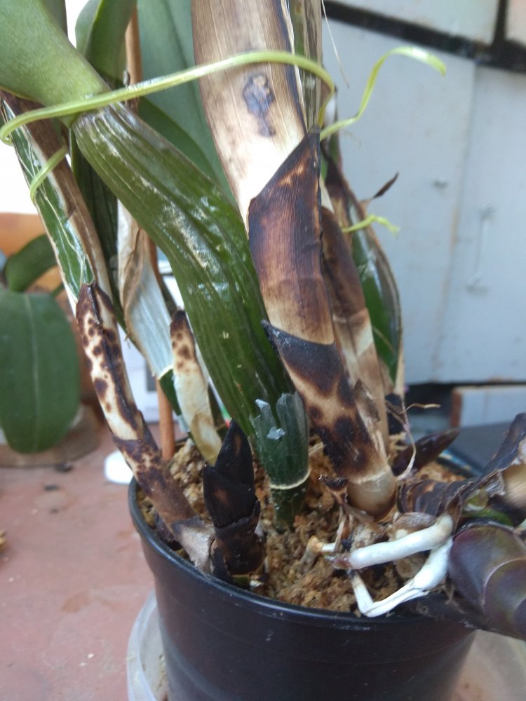 @Цвяточек, на черную каттлейную гниль похоже. Растение было уже с ней, просто сейчас какие то условия резко изменились, даже может цвела, и цветение ее ослабило. При этом поражаются как раз молодые росты, остальные остаются нормальными. Все черное убирайте, желательно одноразовым инструментом. Место это замажьте Максимом. И из него же сделайте раствор с водой и пролейте корни. Дальше ее в тепло без холодных ночей, но и жару нельзя. Прямое солнце пока тоже не надо, но свет должен быть хороший. И наблюдайте. Если остановится, хорошо. Через время появится другой новый рост. Если будет расти здоровым, все нормально с ней значит. Но до следующего раза. Если снова сценарий повторится, смысла эту каттлею дальше растить никакого, так и будет периодически "умирать". Да, и это заразно, поэтому держите ее отдельно.