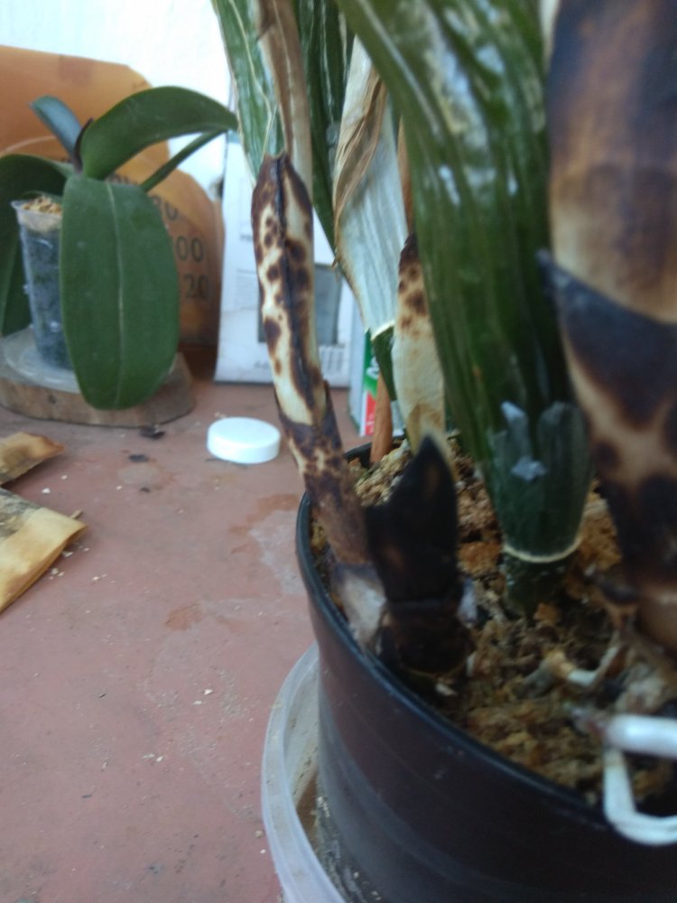 Вчера тоже привезла из ПВЗ новый субстрат от Гроутек, сегодня сажала в него две свои новые каттлеи от РОМ. Обе взрослые, с чехлами. С виду просто роскошные (во мхе обе). Всегда убираю на новых каттлеях со старых бульб сухие кроющие чешуйки, потому что под ними бывает прячутся щитовки и болезни. Ну и на одной бульбе под кроющим листом оказалась чернота уже приличного размера, к ризоме подползающая... Причем, сама бульба отлично выглядит, надутая, лист отличный... Вот тебе и шикарное готовое к цветению растение... пришлось резать((.