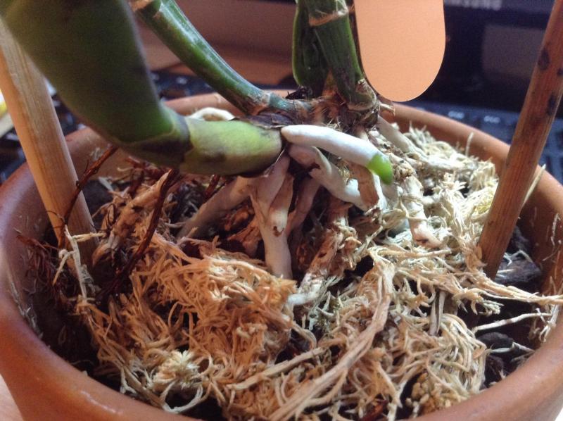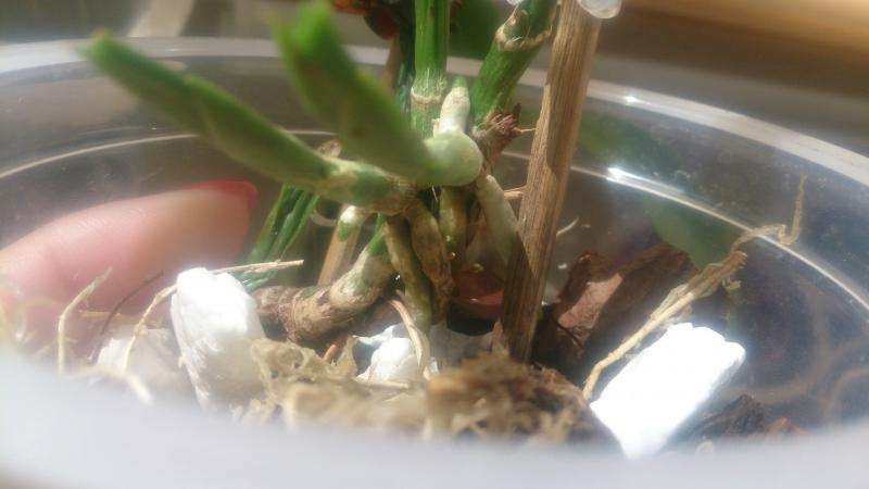 В тепличке почки раскрылись, вылезли 2 роста. Корешки пошли в рост. Закрепила над горшком. Вроде бы все было хорошо. Доходят корни до коры и все, движение прекращается. Но корни, которые растут вверх, тоже не выглядят особо здоровыми - рост медленный, худышки и толщина по мере роста не одинаковая. Не выглядят здоровыми.